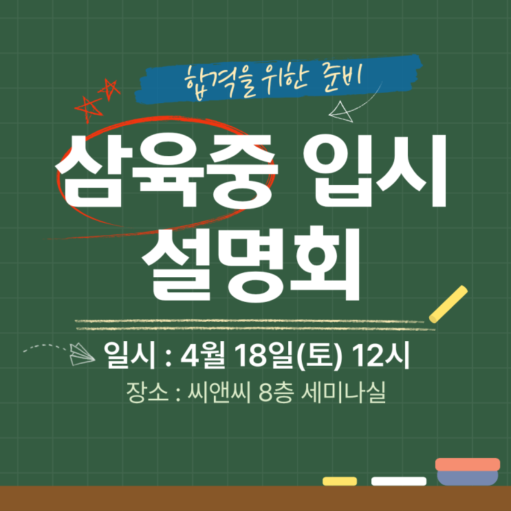 몇일 후 삼육중 학교설명회가 4/8과 4/15(수)일 2차에 걸쳐 실시할 예정으로 매년 학교설명회와 함께 학부모님의 관심도 높아지고 있습니다. 저희 씨앤씨는 "서울 삼육중입시에 도전"이라는목표를 세우고 준비하는 6학년 학생들과 학부모님들 위해 4/18 토요일 12시에 설명회가 한번 더 진행됩니다. 학교설명회 내용을 바탕으로 2027학년도 서울삼육중학교 입시 준비과정과 새로운 유형에 대한 정보와 변화된 입학전형을 알고 성공하는 입시 전략을 위한 "Top Secret"을 안내드릴 예정입니다. ㅣㅣㅣㅣㅣㅣㅣㅣㅣㅣㅣㅣㅣㅣㅣㅣㅣㅣㅣㅣㅣㅣㅣㅣㅣㅣㅣㅣㅣㅣㅣㅣㅣㅣㅣㅣㅣ 설명회 신청은 아래링크로 신청가능합니다. (신청....... <img src="https://blogthumb.pstatic.net/MjAyNjA0MDZfMjk3/MDAxNzc1NDY0NjI5MTY5.g6DUXDIzr63msUH5sdlEpr4ErHRMbs9ehw0UHksW-Rog.SXg7NWn5qsM5uI2uZ4ziDFj15PwMTTskYieoMphFq-gg.PNG/%C1%A6%B8%F1%C0%BB_%C0%D4%B7%C2%C7%D8%C1%D6%BC%BC%BF%E4._%281%29.png?type=s3" />