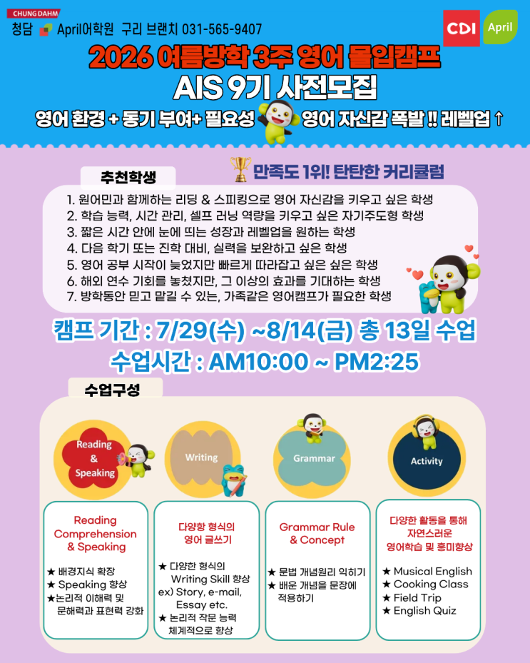 ✨ 올 여름, 영어 실력이 확실하게 바꿀 수 있다면? 레벨별로 반구성이 특징인 캠프로 입소문난 캠프특강 신입생은 입반테스트후 레벨별 맞춤수업 영어 환경 + 동기부여 + 실력 상승까지 한 번에! 2026 여름방학 3주 영어 몰입캠프 (AIS 9기) ✔ 원어민과 함께하는 Reading & Speaking 집중훈련 ✔ Writing / Grammar / Activity까지 탄탄한 커리큘럼 ✔ 짧은 기간에도 눈에 보이는 레벨업 이런 학생에게 추천 ✔ 영어 자신감을 키우고 싶은 학생 ✔ 자기주도 학습 습관을 만들고 싶은 학생 ✔ 다음 학기 대비 + 실력 업그레이드가 필요한 학생 ✔ 늦게 시작했지만 빠르게 따라잡고 싶은 학생 캠프 일정 7/29(수....... <img src="https://blogthumb.pstatic.net/MjAyNjA0MTVfMTA0/MDAxNzc2MjU1MzM0NDg5.snV04cHM659v9NF3IMjHcmXJBy55VXRri20ql9FgZr0g.2PcHOhNnYINMr66XkYaSlXa4qJMGxxKtlsMJzoLIEy8g.PNG/3.png?type=s3" />