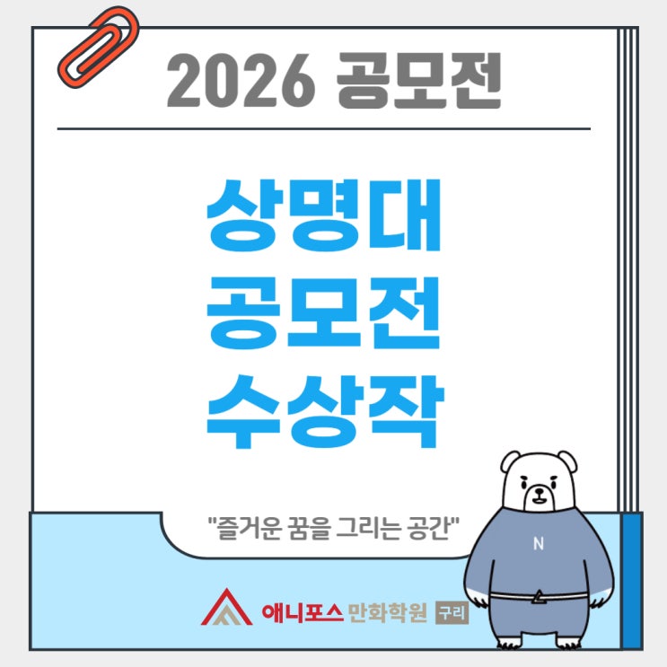 안녕하세요~! 그림이 즐거워지는 웹툰학원 구리애니포스입니다. :) 오늘 소개해드릴 2026 공모전은 상명대 만화애니메이션 공모전으로 상명대 공모전은 막상 준비해보면 생각보다 훨씬 빡빡한 구조라는 걸 느끼게 됩니다. 시간은 제한되어 있고 분량도 정해져 있는데 그 안에서 캐릭터, 이야기, 연출까지 다 보여줘야 하기 때문입니다. 그래서 단순히 그림을 잘 그리는 것만으로는 부족하고 실제 입시처럼 전체적인 완성도를 끌어올리는 경험을 하게 됩니다. 이런 이유 때문에 상명대 공모전은 실력을 점검하는 용도로도 굉장히 의미 있는 과정이에요~ 구리애니포스 웹툰학원에서도 이 공모전을 단순한 대회가 아니라 입시를 미리 경험하는 과정....... <img src="https://blogthumb.pstatic.net/MjAyNjA0MjBfODYg/MDAxNzc2Njk1NzgwMDQw.dDlLlaVCaMphH-IYQR-UzmSUKKgJY2jqmm1qM6VvlRcg.M4tKKYLJdmIojaAO6yQLnPhC3-FSqBjwbLhW52GZ46cg.JPEG/%C1%A6%B8%F1%C0%BB_%C0%D4%B7%C2%C7%D8%C1%D6%BC%BC%BF%E4_-001_%282%29.jpg?type=s3" />