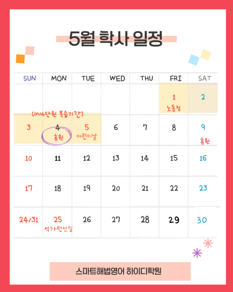 [스마트해법영어하이디학원] 5월 학사 일정 및 주요 안내