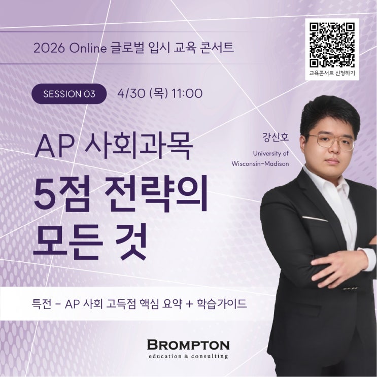 2026 브롬튼 온라인 웨비나 Session 03. AP 사회과목 5점 전략의 모든 것 최고의 글로벌 입시 전문가들에게 길을 묻다! 브롬튼 온라인 웨비나 Session.3 Open! AP 사회과목 5점 전략의 모든 것 [4/30(목) 11:00] Lecturer - Brynden 브롬튼 AP 사회 전문강사 / University of Wisconsin-Madison ✏️교육콘서트 신청 바로가기 Click! -AP 사회과목, 암기 부담은 줄이고 점수 효율은 높이는 학습법 -5점을 가르는 디테일, 학교 수업만으로는 부족한 핵심 포인트 -학년별 AP 사회과목 선택 전략과 과목별 준비 순서 -학교 진도 1년치를 압축해 따라잡는 AP 사회과목 학습 로드맵 참석특전 : AP 사회과목 고득점 핵심 요약 노트 & 과목별 학습 가....... <img src="https://blogthumb.pstatic.net/MjAyNjA0MjlfMTQ0/MDAxNzc3NDIxMTgwNTk4.SpEPQxY04iBxZlAwErj_LLBgNhtOj9LS7Q_aG4NF3twg.yxkgZOOZbA9w39EV43lgeFlSMD_k3sp0xojamOXdBlYg.JPEG/260430_%B1%B3%C0%B0%C4%DC%BC%AD%C6%AE_03-02.jpg?type=s3" />