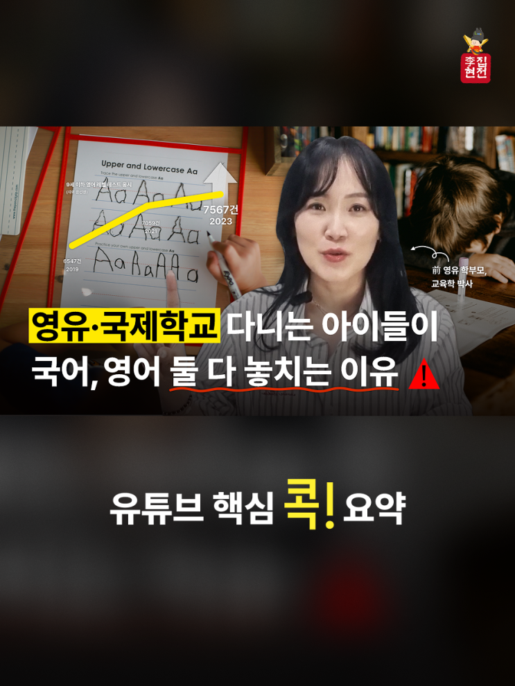 안녕하세요. 대치동 리즈집현전입니다. 최근 교육부 발표 보셨나요? 영유아 고시가 사회 문제로 대두되면서 정부가 소매를 걷고 나섰습니다. [기사 참고] 그러나 단순히 영어 유치원에 가느냐, 마느냐. 국제학교에 진학하느냐, 마느냐. 보다 중요한 것은 우리 아이가 과연 그 교육을 소화할 수 있는가입니다. 그래서 대치동 리즈 집현전이 영유와 영어 교육에 대해 낱낱히 파헤쳐 보았습니다. 특히 영유 前학부모로서 대표님의 진솔한 후기부터 영어 교육과 사고력 발달의 기초가 되어 줄 영유아 도서 추천까지 지금 바로 대치동 리즈집현전 유튜브에서 확인해 보세요 [유튜브 핵심 콕! 요약] 영유·국제학교 다니는 아이들이 국어, 영어 둘....... <img src="https://blogthumb.pstatic.net/MjAyNjA0MjRfMjAg/MDAxNzc3MDA2MTA5NDI0.3bMNreuMC5OW8nSCILFAnnDQHceEsJNK1OvAHmAKZFIg.MdBMpvcEC-7--rVL5ViuFTG3hwjYd0Rdl8gWGq5bLf4g.PNG/1.png?type=s3" />