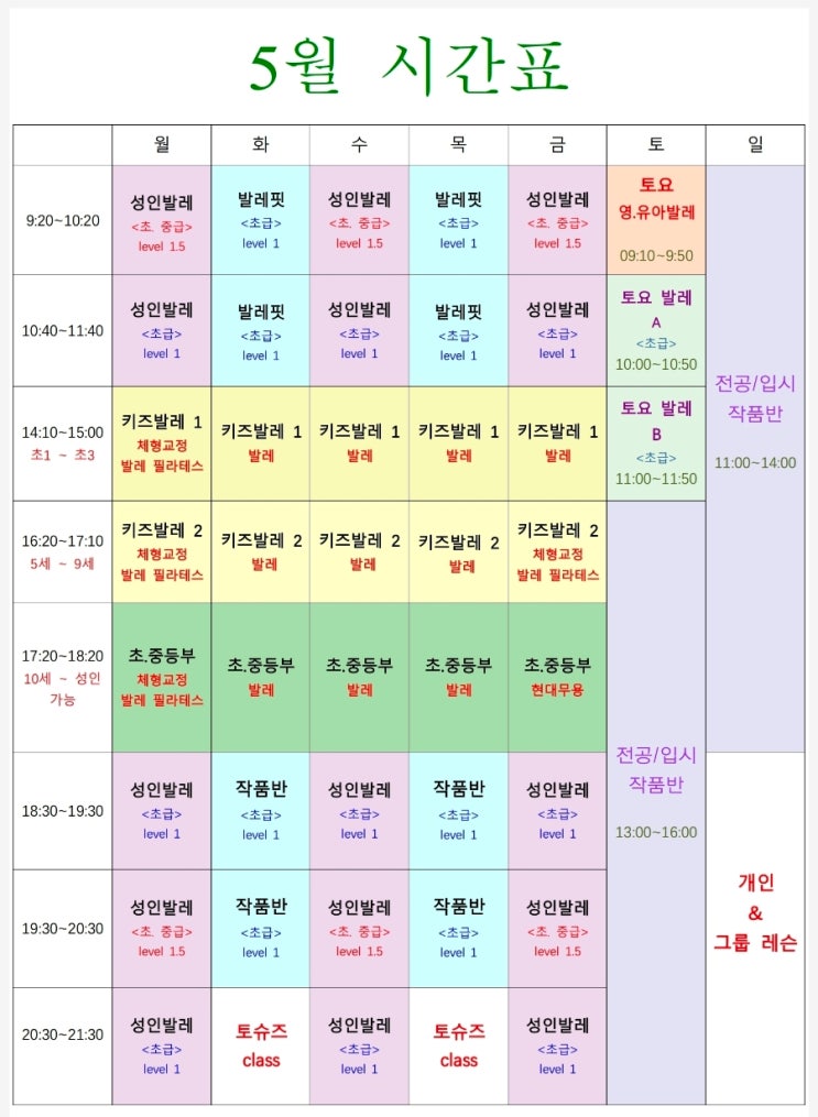 안녕하세요~^^ #바른자세 #예쁜몸매 이루다 무용학원 5월 수강 신청 안내해 드립니다^^ 2026년 5월 시간표 / 수강신청 안내 입니다. ⚠️ 5월 1일, 5월 5일, 성인반 수업만 있습니다. ⚠️ 5월 25일 월요일은 전체 학원 수업 휴강 입니다. ⚠️ 등록 기간 : 5월 1일 금요일까지 (기존 회원 우선 등록 후 신규회원 인원 수 조정) ⚠️ 장기 수강이 끝나신 회원님께서는 별도로 문의 주시기 바랍니다. ⚠️ 성인반 정원 : 15명 (입금 선착순 마감‼️) 유. 초등부 정원 : 12명 ⠀ ✅ 5월 성인발레 수업 스케줄 ✅ ⠀ ✔ 성인발레 오전반 ✔ 5월 13일 수요일 개강 ~ 6월 10일 수요일 종강 ✔ 성인발레 오후반 ✔ 5월 13일 수요일....... <img src="https://blogthumb.pstatic.net/MjAyNjA0MjVfMTU0/MDAxNzc3MDg3MzA1Mzg2.lCKEWrl4ymb9pNncAPBh3pSyOC3dL7Q3gh1xnQEOpW0g.OOY8qSAAqVZaAu9UHSoHRjq8t_1Nk7qxsJU-6knArsYg.JPEG/900_Screenshot_20260425_093201_Polaris_Office.jpg?type=s3" />