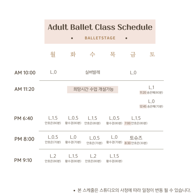 < 발레스테이지 성인 발레 수강 안내 > 안녕하세요, 발레스테이지입니다. 새로운 계절, 새로운 마음으로 수업이 시작됩니다. 발레스테이지는 매달 새로운 프로그램으로 건강하고 바른 움직임을 추구하며, 모든 수업은 4주 단위로 진행됩니다. 성인 발레, 이런 분들께 추천해요! • 바른 체형 교정과 아름다운 라인을 원하시는 분 • 유연성과 근력을 함께 키우고 싶은 분 • 스트레스를 해소하며 힐링이 필요하신 분 • 처음이라 망설여도 기초부터 차근차근 배우고 싶은 분 발레 경험이 없어도 누구나 시작할 수 있습니다. < 시간표 > · 개인레슨 문의 받습니다. · 문의- 카카오채널) 발레스테이지 개인레슨 문의- 카카오채널) 발레....... <img src="https://blogthumb.pstatic.net/MjAyNjA0MjFfMTQ1/MDAxNzc2NzU5MjAzMDg3.G09dgupop17nmZzrPaGvvK_gRa-K-gPKedZOxn66Eqgg.YlCa9g2IJdjCfz1-0gmC4Oc0MtMxEEMWMaWrKQLvUREg.PNG/IMG_1005.png?type=s3" />