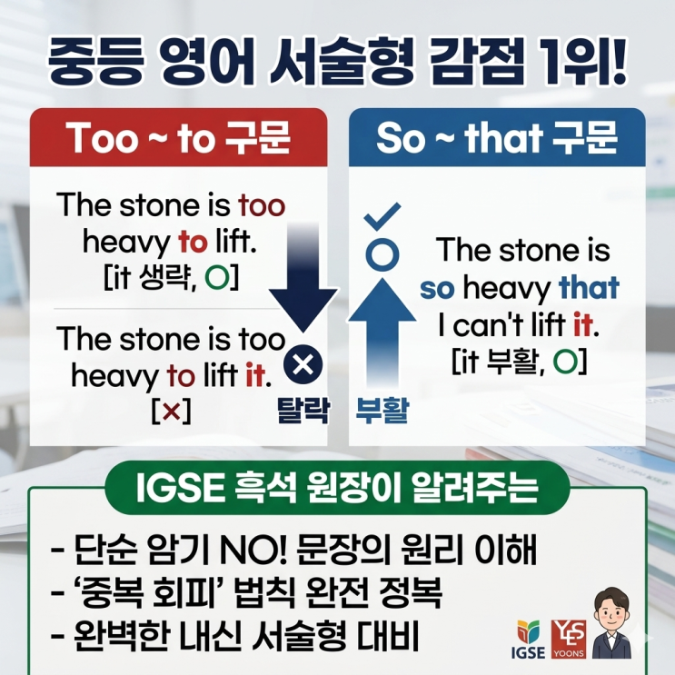 안녕하세요! 중등 영어의 결정적 한 끗을 잡아주는 IGSE 아카데미 흑석 영어학원 원장입니다. 우리 아이들이 Too ~ to 구문을 이미 아는 쉬운 문법이라고 생각하고 방심합니다. 하지만 실제 중등 내신 서술형에서 가장 많이 감점이 나오는 부분이 어디일까요? 바로 **'대명사 목적어(it/them)'**를 써야 할지, 말아야 할지 결정하는 순간입니다. "선생님, 이 문장은 it을 썼는데 왜 저 문장에서는 빼야 하나요?" 오늘은 중등 내신 만점을 결정짓는 영어의 대원칙인, **[동일 명사 반복 회피]**를 통해 이 문제를 뿌리부터 뽑아드리겠습니다. 1.TOO ~ to 구문 : 중등 서술형 [목적어 탈락]의 현상 중등 문법의 핵심인 To....... <img src="https://blogthumb.pstatic.net/MjAyNjA0MjdfMSAg/MDAxNzc3MjI5NDg4ODE5.I7oegbNQL073glqOb4Lfi0tBPU2zoCaji7R7YyhtadUg.0tKwFw0fs26vvoCINLYRIHgej-Td7QwMFtBLtUOQjA8g.PNG/too_to_so_that.png?type=s3" />