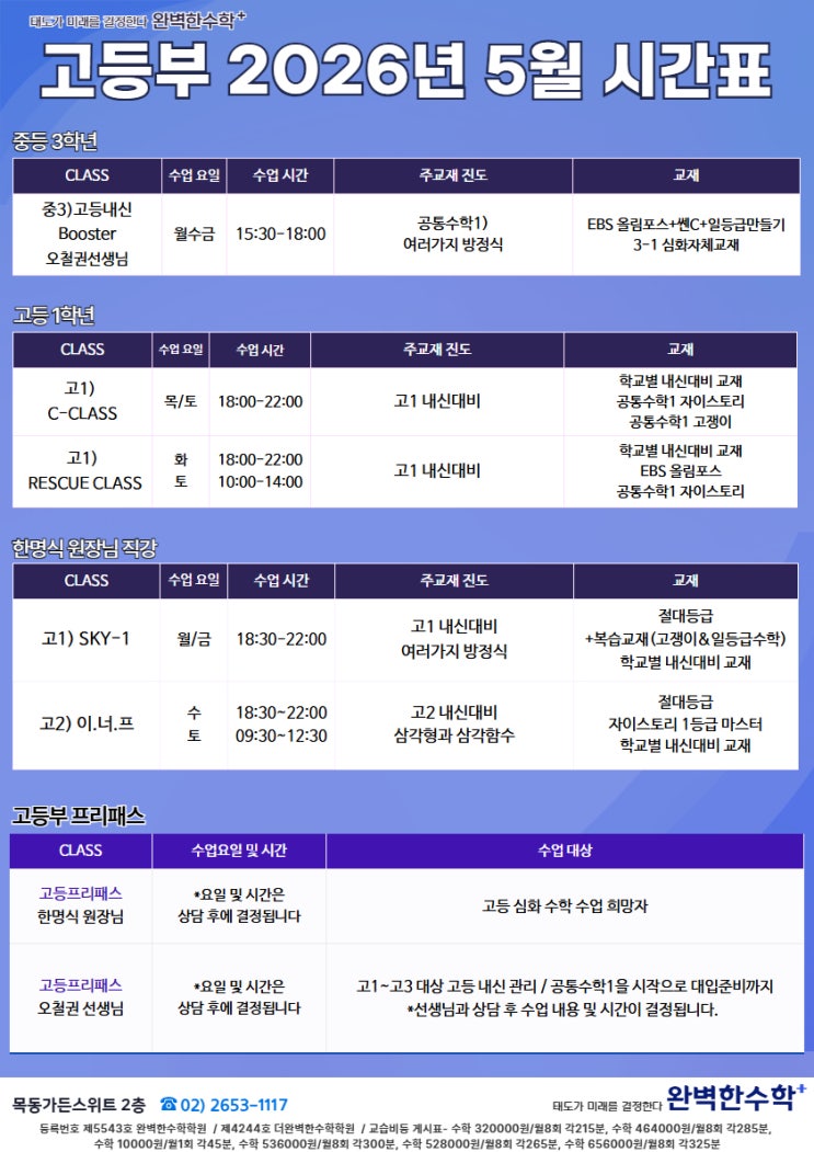 [목동수학학원 / 완벽한수학 ] 2026년 5월 완벽한수학 고등부 시간표 안내 입니다.