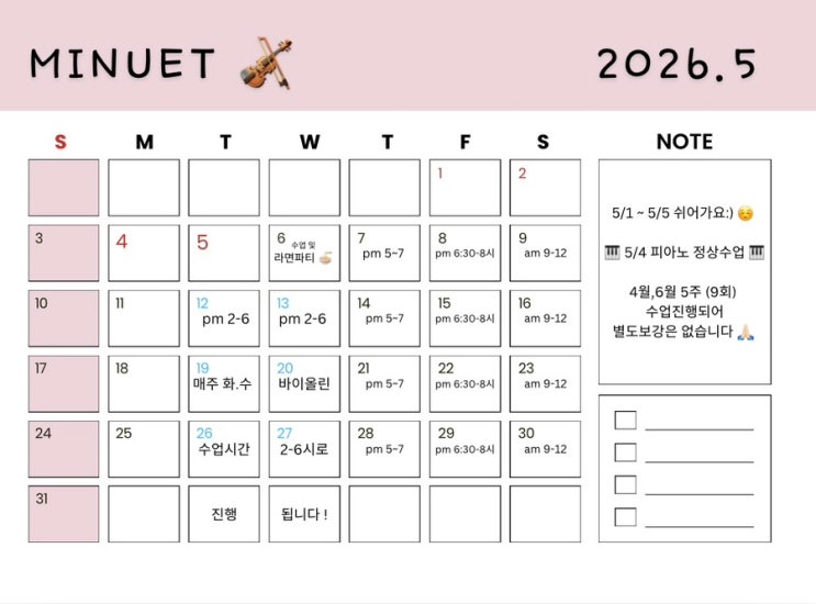 어느새 5월입니다 . 1년중 가장 좋아하는 달이에요 ! 아이들이 매해 기대하고 있는 어린이날 옥상 라면파티는 5/6 일 수요일에 예정되어있으며 ➡️ 5/1 노동절 ➡️ 5/5 어린이날은 쉬어갑니다 . 위시간은 [바이올린] 시간표 피아노는 월-금 주5회로 진행됩니다 #군산바이올린 #군산피아노 #군산음악학원 <img src="https://blogthumb.pstatic.net/MjAyNjA0MjhfMTgy/MDAxNzc3MzQ2NTIyNzAz.zA2s_BXzB8Uuw8_V1MVWCFnrkhNLRKy3DC5XnRPNn5Yg.xUw4m_TftozyhTyVirxNN2MyaMXwuFSU1grsWBso9m8g.JPEG/IMG%A3%DF4397.jpg?type=s3" />