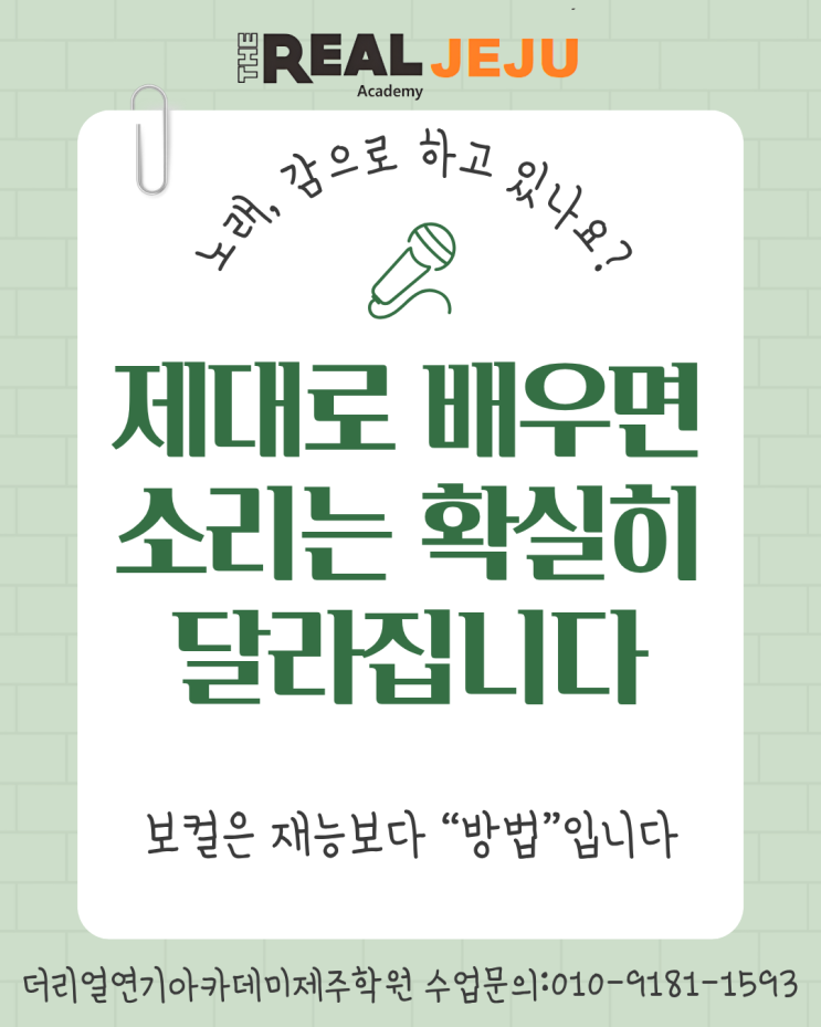 더리얼연기아카데미 제주 보컬수업 안내 노래, 감으로만 하고 계신가요? 혼자 연습하다 보면 ✔ 고음에서 목이 잠기고 ✔ 금방 지치고 ✔ 소리는 나는데 전달이 안 되는 문제 이런 경험, 대부분 한 번쯤 겪습니다. 결론부터 말하면 보컬은 “재능”보다 “방법”입니다. ✔ 좋은 소리는 어떻게 만들어질까요? 좋은 보컬은 단순히 목으로 내는 소리가 아닙니다. 아래 3가지 요소가 동시에 맞물려야 합니다. ✔ 호흡 (Airflow) ✔ 성대 컨트롤 (Vocal fold control) ✔ 공명 (Resonance) 이 세 가지가 균형을 이루면 힘을 많이 쓰지 않아도 안정적인 소리가 만들어집니다. ✔ 왜 워밍업이 중요한가요? 노래는 “근육 사용”입니다. 준비 없이....... <img src="https://blogthumb.pstatic.net/MjAyNjA0MjNfMTc1/MDAxNzc2OTM2NDcwMDc0.-hVcCAvY-m8bezzyVq6dG1tGKgAkopLO9iNa5sqOG5kg.gb8M0BtNm22TGZtVl5FB80WzoUp3mmpl6Miz2RvBIBkg.PNG/1.png?type=s3" />