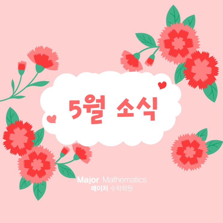 중간고사가 끝나면 날씨도 좋고 연휴도 많고 아무래도 풀어지기 좋을 때입니다. 하지만 아직 2026년은 많이 남았습니다. 시험이 끝난 후의 해방감은 짧게 해소하시고, 평상시의 루틴을 빠르게 찾아가시기 바랍니다. 메이저수학학원 5월 소식 알려드립니다. 상세일정은 아래 링크에서 확인해주세요! ① 휴관일 5월 4일(월)은 재량휴업일로 5월 5일(화)은 어린이날로 휴관합니다. 반드시 확인하시고 착오 없으시기 바랍니다. ② 공휴일 오전수업 5월 1일(금) 근로자의 날과 5월 25일(월) 부처님오신날 대체휴일은 오전 수업으로 정상수업합니다. 학생마다 정해진 시간이 있으니 반드시 확인 부탁드립니다. ③ 중학교 1학년 1학기 자체....... <img src="https://blogthumb.pstatic.net/MjAyNjA0MTVfMzkg/MDAxNzc2MjQxODg5NTMx.4RUop_VEDf72_FgTNolueFVFYZ8nZpSw5Mu9qhypGMgg.Zlh6fGxotVzbqIsakLKcrSwJm5tp9BHkAs1PUyu_T8gg.PNG/5%BF%F9%BC%D2%BD%C4.png?type=s3" />