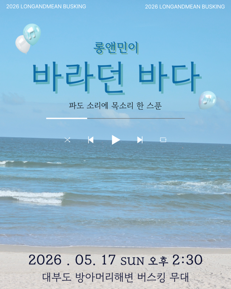 안녕하세요 '꿈을만드는노래소리' 안산실용음악학원 롱앤민보컬아카데미 초지점 입니다:) 이번 버스킹은 조금 더 특별한 의미를 담고 있습니다 "롱앤민이 바라던 바다" 파도 소리 위에 아이들의 목소리를 얹는 그 순간을 만들어보려고 합니다 처음으로 떠나는 바다 무대 대부도 방아머리해변 "롱앤민이 바라던 바다" 일시: 2026년 05월 17일 일요일 오후 2:30분 장소: 대부도 방아머리해변 버스킹 무대 이번에는 조금 더 넓은 공간으로 나아갑니다!! 바로 대부도 방아머리해변 버스킹 무대✨ 바다를 배경으로 아이들이 노래를 부르는 순간은 그 자체로 잊지 못할 기억이 될 거 같은데요 파도....... <img src="https://blogthumb.pstatic.net/MjAyNjA0MjBfMTk3/MDAxNzc2NjY4Nzg3NjY0.uS2sLkTSdsfQKICpTYj4G5dUF9D7TVkMR_L4GTWqK0kg.NkKYHnAzhn1dCaTGQU2v_YwKF50AunF-30KWvacZg-Mg.PNG/KakaoTalk_20260420_153128073.png?type=s3" />