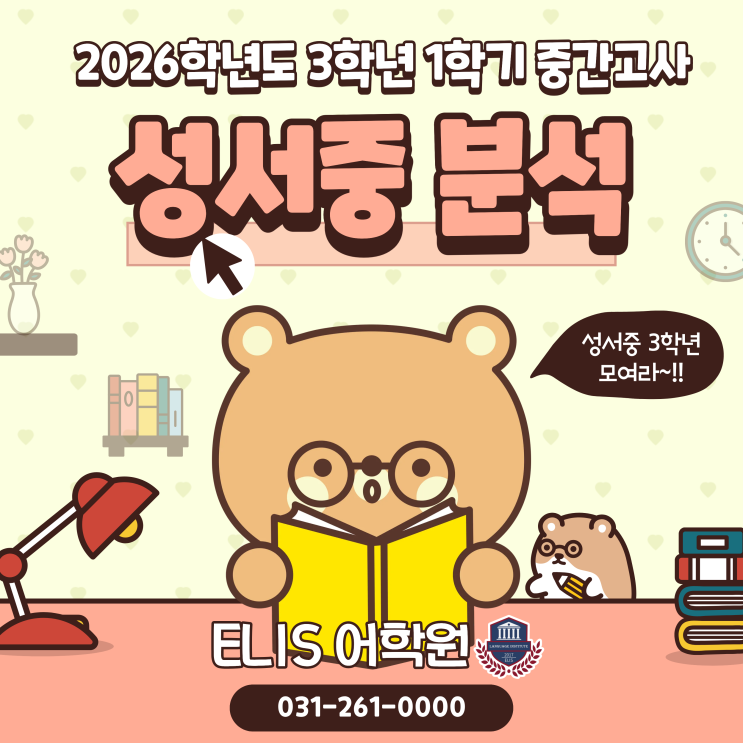 안녕하세요~ ELIS 어학원 입니다. 이번 시간에는 성서중학교 3학년 1학기 분석을 해보도록 하겠습니다! 2026학년도 성서중학교 3학년 1학기 중간고사 영어 ELIS 어학원 난이도 및 유형 분석 (담당: Jess T) 1. 시험 총평 ① 시험 범위 : 동아(윤정미) 1~2과 + 외부지문 2개 ② 문항 수 : 선택형 (22문항) , 논술형 (2문항) ■ 전체 난이도 총평 전체 난이도: 중상(中上) 2. 100% 적중 ELIS 자체교재 및 보충 자료 2~3년 이상 성서중학교 내신을 직접 지도해 온 선생님들로 구성되어 있으며, 모든 수업 자료는 실제 지도 경험에서 축적된 노하우를 바탕으로 직접 제작합니다. 보충자료 (1) [학교 프린트 뜯어먹기] 학교에서 배부한 프린트를 단순....... <img src="https://blogthumb.pstatic.net/MjAyNjA0MjhfOTkg/MDAxNzc3MzU5NTEyNTY1.WvANxoQeZIFVPepdzfahatzjx8GAMmAIrPsuvTEwJqEg.uGxNrhbzraTKaifVYeEt9EGTGsLyXm_o_dHH0AIWoMgg.PNG/5.png?type=s3" />