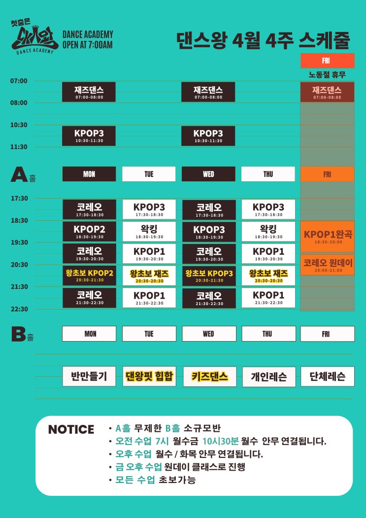 4월 27일 BTS 훌리건 하츠투하츠 루드 아이브 뱅뱅 제니 왁킹 코레오 재즈댄스 댄스왕 시간표 신촌댄스학원 (노동절 휴강)