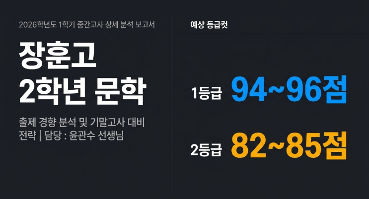 장훈고2 문학 중간고사, '역대급 평이함' 속에 숨겨진 1등급의 함정 2026년 4월 28일 시행된 장훈2 문학 시험은 역대급 평이한 난이도로 출제됐습니다 서답형 문항이 단 한 문제도 출제되지 않았고, 문제의 대다수가 교과서의 기본 내용을 충실히 반영한 상태로 출제되었습니다 역대급 난이도의 영어와 상반된 난이도를 보고 아이들은 편안했겠지만 시험이 쉬울수록 상위권 점수 밀집도는 극도로 높아지며, '실수'는 단순한 오답을 넘어 등급의 하락으로 직결되는 치명타가 됩니다. 서답형 0%, '난이도 하' 34%가 만든 역대급 평이함 "이번 장훈고 2학년 문학 시험은 근래 장훈고 시험 중 난이도가 가장 쉬운....... <img src="https://blogthumb.pstatic.net/MjAyNjA0MzBfNDgg/MDAxNzc3NTI4NDAxMDQw.gZrWbAe_Q_WOCoNIYP1by97Wi4omjmhCfxFWGL5SGC0g.n9GOTMvHcVPvnFQOA99Vet5bEvtvZgv0lujrt5GRSVwg.PNG/%C0%B1%B0%FC%BC%F6t_%B0%ED2.png?type=s3" />