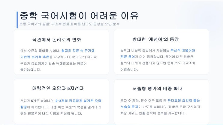 중학교 국어 시험은 대체로 어렵습니다. 초등 시절에 '국어 좀 한다'고 했던 아이들도 막상 중학교에 올라가 시험을 치르고 나면 풀이 죽는 게 사실입니다. 초등학교 때와 달리 갑자기 어렵게 느껴지는 데에는 구조적인 이유가 있습니다. 주요 원인을 분석해 보면 다음과 같습니다. 1. '직관'에서 '논리'로의 변화 초등 국어는 상식 선에서 풀 수 있는 문제가 많습니다. 하지만 중등 국어는 철저히 지문 속에 근거를 두고 논리적으로 추론해야 합니다. 전반적으로 지문이 복잡하고 난해해지는데다 문장과 문장, 문단과 문단 간의 논리적 연결 구조 역시 정교해집니다. 단순히 글을 읽는다고 해서 해결되지 않습니....... <img src="https://blogthumb.pstatic.net/MjAyNjA0MjhfOTQg/MDAxNzc3MzY4MjU5OTY2.ysHw4lbNS7LVdJpvZDGvzn_bGMx7oWy7IzEXaIZqyeUg.f-dJnOY2oj0mu-jUP4_8YP6jD1VXd9EfX6I52BrP-G8g.JPEG/%C1%DF%C7%D0_%B1%B9%BE%EE%BD%C3%C7%E8%C0%CC_%BE%EE%B7%C1%BF%EE_%C0%CC%C0%AF.jpg?type=s3" />