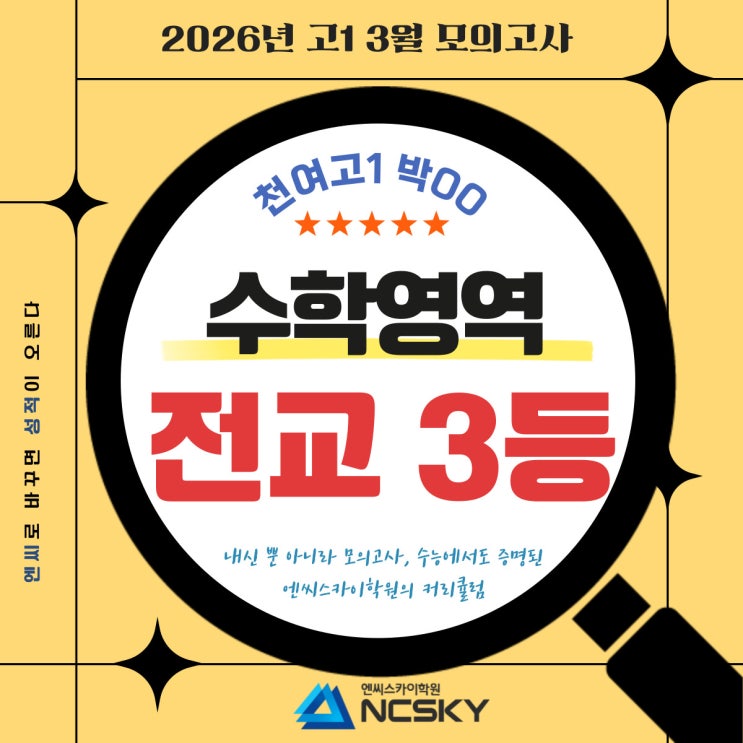 고등학교 입학 후 처음으로 받아든 성적표, 그 무게감이 남다를 텐데요. 엔씨스카이학원에서 천안여고 1학년 박OO 학생이 거둔 놀라운 성적표를 전격 공개합니다! 단순히 말로만 하는 성과가 아닌, 실제 성적 통지표가 증명하는 압도적 실력입니다. [천여고1 박OO] 2026년 3월 모의고사 수학 전교 3등 & 전 과목 최상위권! 성적표를 보시면 알 수 있듯, 박OO 학생은 주요 과목에서 빈틈없는 성적을 기록했습니다. 성적 상세 분석 (학교 석차 기준) 수학 영역: 전교 3등 (1등급급 백분위) 사회 탐구: 전교 4등 (1등급) 과학 탐구: 전교 4등 (1등급) 영어 : 당당히 1등급 달성!!! 한국사: 당당히 1등급 달성!!! 국어 영역: 전교 10등....... <img src="https://blogthumb.pstatic.net/MjAyNjA0MzBfMjI0/MDAxNzc3NDg1NTY3MTQ4.0OmmqJSUVJQ5G0tOu_qK34bXe-hmUwopRtYkRigJcwQg.5meI-rRwoq8HsveCAt8kaAD4yzmKQ-WZacl_Ko5-epAg.JPEG/25%B3%E2-%BC%BA%C0%FB-006.jpg?type=s3" />