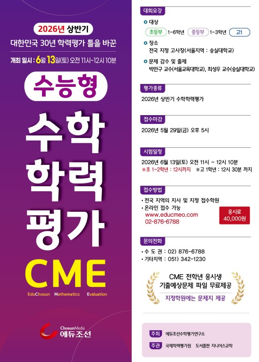 안녕하세요! 우리 아이의 수학 실력을 객관적으로 점검하고, 멀리 '수능'까지 바라보는 사고력을 기를 수 있는 좋은 기회가 찾아왔습니다. 에듀조선에서 주관하는 2026년 상반기 CME(수능형 수학학력평가) 개최 소식을 정리해 드립니다. 초등학생부터 예비 고등학생까지, 수학적 추론과 창의융합 능력을 확인하고 싶은 학생들은 주목해 주세요! CME 수학학력평가란? 단순한 계산 위주의 평가가 아닙니다. 초·중등 과정의 수학 개념을 수능형 문항으로 연결하여, 고등 수학의 고난도 문제를 해결할 수 있는 토대를 마련하는 평가입니다. 주관: 국제학력평가원, 도서출판 지니어스교육 주최: 에듀조선 수학평가연구소 1. 시험 일정 및 장....... <img src="https://blogthumb.pstatic.net/MjAyNjA0MDNfMTc1/MDAxNzc1MjAyNTE4NTkw.VaEMbsF613egp0DgAJc8tbkM7OrSpvZW_7H93MyRI28g.ih71P8MYAdvC9Tg-XNE-LDLOEhaTJGcPyfx7tZ-Nu8Eg.PNG/image.png?type=s3" />