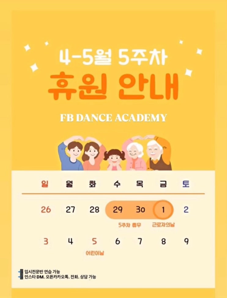 창원춤 창원댄스학원 에프비댄스아카데미에서 알려드립니다! 4월 5주차 (수/목) 5월 1일 (금) 노동절 모든 클래스 휴무 입니다 ✨ 방문 상담 외 모든 상담은 진행하니, 편하게 상담 부탁드리겠습니다! Insta DM : fbdance Open kakao : fbdance 055)284-1630 <img src="https://blogthumb.pstatic.net/MjAyNjA0MjlfMjM0/MDAxNzc3NDMyMzM5MDkz.xEiP22kKtszPw7K2T2KI3jZSjlD66O3mUMCLYLLDCb4g.oeOkYmyhMGcUoTX7Spk3jLqwufa2hhWZJmK1XBfySs4g.JPEG/IMG%A3%DF7980.jpg?type=s3" />