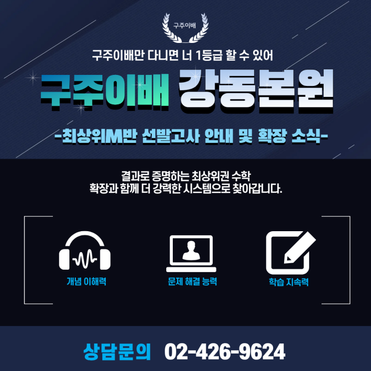 안녕하세요 구주이배수학 강동본원입니다 이번에 많은 분들이 기다리셨던 최상위 학습관 확장 소식과 함께 중요한 일정이 함께 진행됩니다 학습관 확장, 왜 중요한가 구주이배수학 강동본원은 최상위권 학생들을 위한 학습 환경을 강화하기 위해 최상위 학습관을 확장하게 되었습니다 확장된 학습관은 단순한 심화반이 아닌 최상위권 전용 커리큘럼 최상위 목표 학생 집중 관리 결과 중심 학습 시스템 으로 운영되는 핵심 프로그램입니다 확장과 함께 진행되는 설명회 학습관 확장에 맞춰 중등 초등 설명회가 함께 진행됩니다 설명회에서는 최상위권으로 올라가는 학습 전략 최상위M반 수업 운영 구주이배만의 커리큘럼 을 자세히 안내드릴 예정....... <img src="https://blogthumb.pstatic.net/MjAyNjA0MjdfMjkw/MDAxNzc3MjY1MjUyMjMy.oZ8y4xFoD4CTomK0kRUo2iKrDd-PZb2t-mzwubVi9iYg.8NcZ9m9gxvoW7hqSHjQinQ3NW4G4UfatpKRhnkPFCg8g.PNG/%C1%A6%B8%F1%C0%BB_%C0%D4%B7%C2%C7%D8%C1%D6%BC%BC%BF%E4._%2818%29.png?type=s3" />