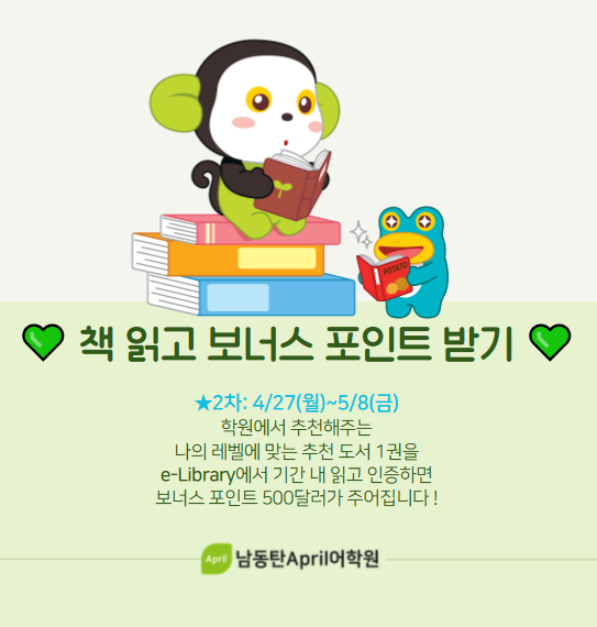 안녕하세요 남동탄 에이프릴입니다. :) 북플릭스 외전 1차전은 4/24(금) 일자로 마감되었습니다! ★ 2차: 4월 27일(월) ~ 5월 15일(금) 마지막 2차 외전 이벤트! 학원에서 추천하는 도서 1권을 (e-Library에서 리딩 가능) 기간 내 읽고 인증하면 보너스 포인트 500달러씩 전달됩니다 레벨별 추천도서 가 장 중 요 한 ⭐인증 방법⭐ 1. 나의 레벨에 맞는 추천도서 읽기 2. 다 읽고, 아래 블로그 댓글 쓰기로 내려가기 3. 댓글 창에 ✅ 아래 내용 모두 기재 후 등록 ! ✅한글이름, 영어이름 ✅나의 레벨 ✅학교,학년 ✅내 레벨 추천 도서 제목과, 책에서 본 가장 인상 깊었던 문장 한 줄 쓰기 댓글 예시: ....... <img src="https://blogthumb.pstatic.net/MjAyNjA0MjRfMTY5/MDAxNzc3MDEyMDYxMTIz.mNOqI-4dd9sKJTXEMN6JCOf1Sn5eLqnETnw4rZwDhYsg.C7benRQz9WroFToXR_hPdswcFgHzbCpmr7h9-_ZbVuAg.PNG/image.png?type=s3" />