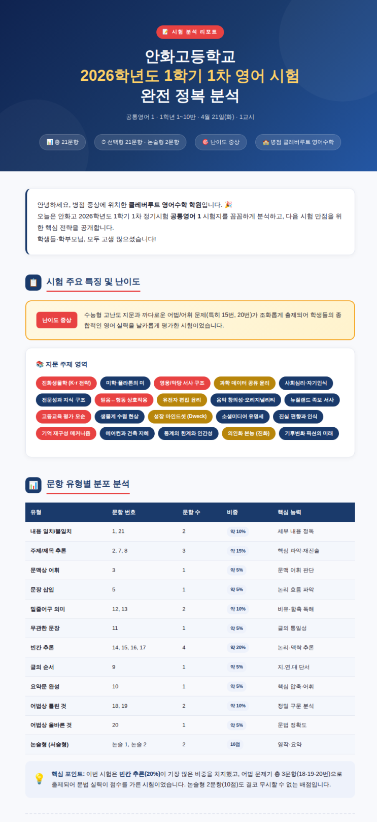 안녕하세요 병점 중상에 위치한 클레버루트 영어수학 학원입니다. 안화고 시험이 마무리 되었습니다. 학생들 학부모님들 모두고생많으셨습니다. 이번 포스팅에서는 최근 치러진 안화고등학교 영어 시험지를 꼼꼼하게 분석하고, 다음 시험에서 반드시 성적을 올릴 수 있는 핵심 학습 전략을 공개합니다. 겉보기엔 평범해 보일 수 있지만, 이번 안화고 시험은 수능형 고난도 지문과 까다로운 어법 문제가 조화롭게 출제되어 학생들의 종합적인 영어 실력을 날카롭게 평가했습니다. 단순 어휘 암기를 넘어 진화 생물학, 사회 심리학, 윤리학, 인지과학등 다양한 배경지식과 영어를 연결하는 능력을 필요로 했습니다. 이번에 분석한 객관식 20문항의....... <img src="https://blogthumb.pstatic.net/MjAyNjA0MjFfMjQw/MDAxNzc2NzYyNDcxMDYw.GJppi5071_2xfw9kdGVieOtekJuJQS5w9298G8xBDUQg.J1AtncFz5NcBTXS_IpZ2x17kMB0sfeXv6WfqwL6AauMg.PNG/blog_page_01.png?type=s3" />