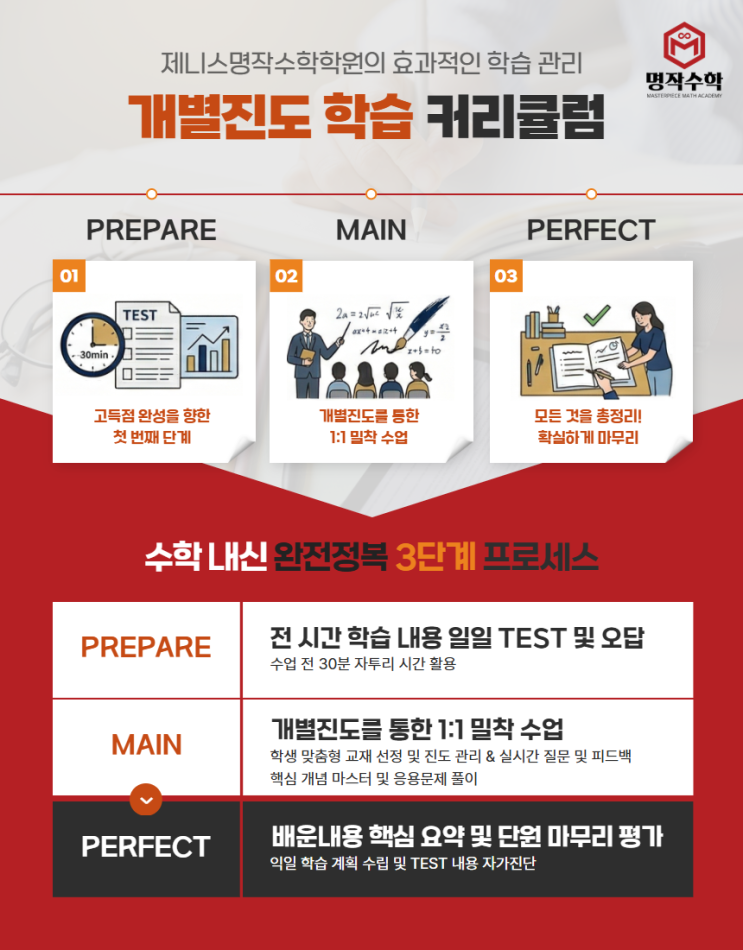 안녕하세요, 제니스명작수학입니다. 어느덧 1학기의 반환점인 중간고사 시즌입니다. 이미 시험을 마친 학생도 있고, 곧 치를 학생들도 있어 원내에도 긴장감과 열기가 가득합니다. 우리 아이들이 흘린 땀방울이 만족할 만한 점수라는 결실로 이어지기를 간절히 바라는 마음을 담아, 저희 제니스명작수학에서는 학습 관리를 더욱 강화하여 5월부터 다음과 같이 운영하겠습니다. 평일 주중 학습 (3단계 PMP) "수학, '아는 것'을 넘어 '풀 수 있을 때까지' 책임집니다.“ [Prepare] 수업 전 30분 개념 확인 수업 시작 30분 전 등원하여 "일일테스트"를 진행합니다. 단순히 듣는 수업이 아니라, 지난 시간의 누수....... <img src="https://blogthumb.pstatic.net/MjAyNjA0MjRfMSAg/MDAxNzc3MDA5OTU4MTE0.M8_t5BQaSpXrhEP05-beHoaT51h1PbNLdeOf5wEYE64g.SGmfg_9rfD5LZDGnDozZg4YuP50L_PdHJP0Xt_kTruAg.PNG/%C6%CA%C7%C3%B7%BF_3.png?type=s3" />