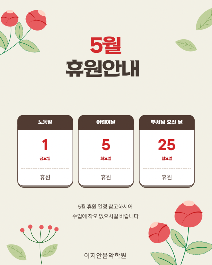 안녕하세요, 이지안음악학원입니다 따뜻한 봄이 완연한 5월, 학원 일정 안내드립니다. 5월은 공휴일이 있는 달이라 수업 일정에 변동이 있으니 꼭 확인 부탁드려요! 휴원 일정 안내 * 5월 1일 (금) : 노동절 휴원 * 5월 5일 (화) : 어린이날 휴원 * 5월 25일 (월) : 부처님 오신 날 휴원 위 날짜에는 수업이 진행되지 않으니 착오 없으시길 바랍니다 그리고 이번 5월에는 아이들이 즐겁게 참여할 수 있는 특별한 수업도 준비했어요! 5월 4일 방탈출 특강 진행 아이들이 음악과 함께 재미있게 참여할 수 있는 방탈출 형식의 특별 활동 수업을 진행할 예정입니다! 단순한 연습을 넘어서 집중력과 문제 해결력, 그리고 음악....... <img src="https://blogthumb.pstatic.net/MjAyNjA0MjNfMTQg/MDAxNzc2ODk5NzUwMzIy.qAZSiuNeb4eQBUof6oNGnmkDYC6glEkO5jI2QQC3Lj4g.Tj1z9Jsitjl1bVgQ_G0bMgwZX4bNYLh2eW9uD3_QUHkg.PNG/IMG%A3%DF0604.PNG?type=s3" />