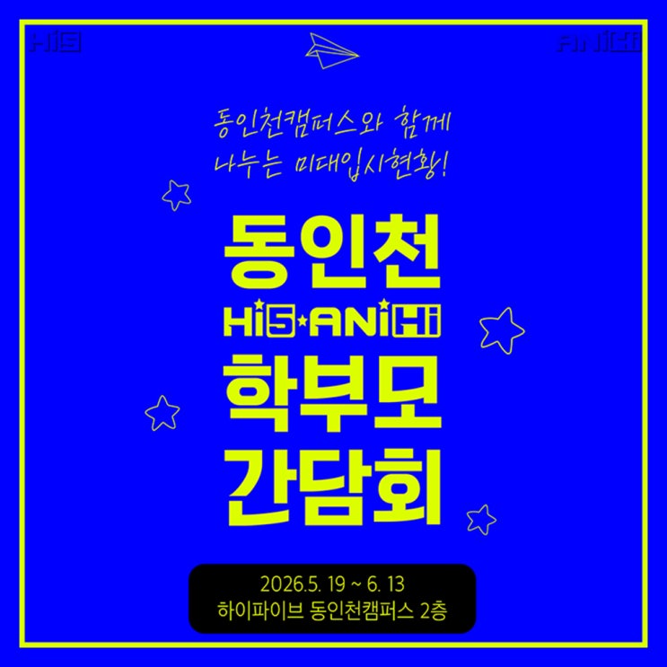 #인천미술학원 #인천중구미술학원 #인천동인천하이파이브미술학원 #동인천애니하이미술학원 #Hi5미술학원 #입시미술학원 #ANiHi미술학원 #중등부 #고등부 #기초조형반 #디자인반 #애니반 #4월 #5월 #학부모님 #입시간담회 안녕하세요! 동인천 Hi5 애니반&CG반 수민T입니다~ 저희 동인천 하이파이브 미술학원은 다가오는 5월 19일 (화)부터 6월 13일 (토) 동안 학부모님들을 대상으로 <개별 입시 간담회>를 진행하게 되었습니다^^ 25년부터 시행된 고교학점제와 내신 5등급제 관련한 입시 준비 팁부터, 중등부 학생들이 관심있게 바라보는 상위권 대학 학생부종합전형 준비 방법까지! 끝으로, 전년도 합격생들의 합격 비결을 기반으로 어....... <img src="https://blogthumb.pstatic.net/MjAyNjA0MjhfMTg4/MDAxNzc3MzU2NjE4MDY3.hzK0hS3Q3t-j3SGeUE1EDie-g8H2fLsgOWF91-PVuGQg.-_02ffD2cyXXbvt8j6xBABcXyOJFzddyf3TwkWumV9Yg.JPEG/4%BF%F9_%BA%ED%B7%CE%B1%D71.jpg?type=s3" />