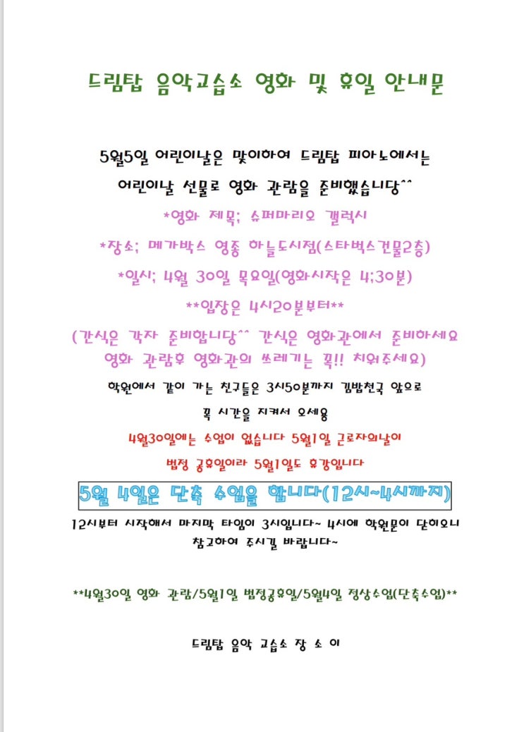 어린이날 선물 영화관 대관 관람 안내문 및 휴일 안내문 5/5일 어린이날을 맞이하여 드림탑음악교습소에서는 영화관을 대관하여 아이들에게 영화를 보여주는 이벤트를 4/30에 합니다~ ^^ 아이들이 사고 없이 영화를 잘보고 올수 있게 학부모님들께서 다같이 기원해주세요~^^ #어린이날_이벤트 #메가박스_영종하늘도시 #영화관대관 #슈퍼마리오갤럭시 #4/30드림탑피아노이벤 <img src="https://blogthumb.pstatic.net/MjAyNjA0MjlfMjQw/MDAxNzc3NDcwMTk0NjU3.kYc7n_QiVtFHaEllrkseLqN7Bq-8C0e-BBUosQ1fNOEg.fYmlOcPtcAfTrWWlIlJJgmKIIAeyKDZkNUeaEMvdEOEg.JPEG/IMG%A3%DF2351.jpg?type=s3" />