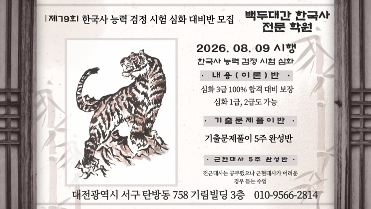 제79회 한국사 능력 검정 시험 심화반 내용(이론)반, 기출문제 풀이반, 근현대사 5주 완성반 모집합니다. 2026년 8월 09일에 시행될 제79회 한국사 능력 검정 시험 심화반을 모집합니다. 5월 2일 주말반부터 대개강을 합니다. 평일반은 일단 화요일반과 수요일반이 선착순 모집하여 빈 자리 없이 모두 등록 완료되었고, 나머지 평일반은 자리가 아직 있습니다. 주말반은 아직 모집 중이므로 등록 가능하십니다. 주말반은 토요일 수업이고, 평일반은 평일 중 택하셔서 수업을 진행합니다. 수업 시간은 주말반, 평일반 모두 똑같이 아침 10시~오후 5시까지(점심 시간 포함) 주 1회씩 12주(3개월) 완성 수업입니다. 진도 내용에 따라 보충 수업이 진....... <img src="https://blogthumb.pstatic.net/MjAyNjA0MjZfODIg/MDAxNzc3MjAxOTEwMjI2.ySKfeOQizTMWaqTozIT2_e0Kr2yVTJkShfcf7BuwGYgg.jQylMuV5MV9XyaaUiFVPWEjYSMq_GDJRSfLo1s1bFQcg.PNG/%C1%A6%B8%F1%C0%BB_%C0%D4%B7%C2%C7%D8%C1%D6%BC%BC%BF%E4._%285%29.png?type=s3" />