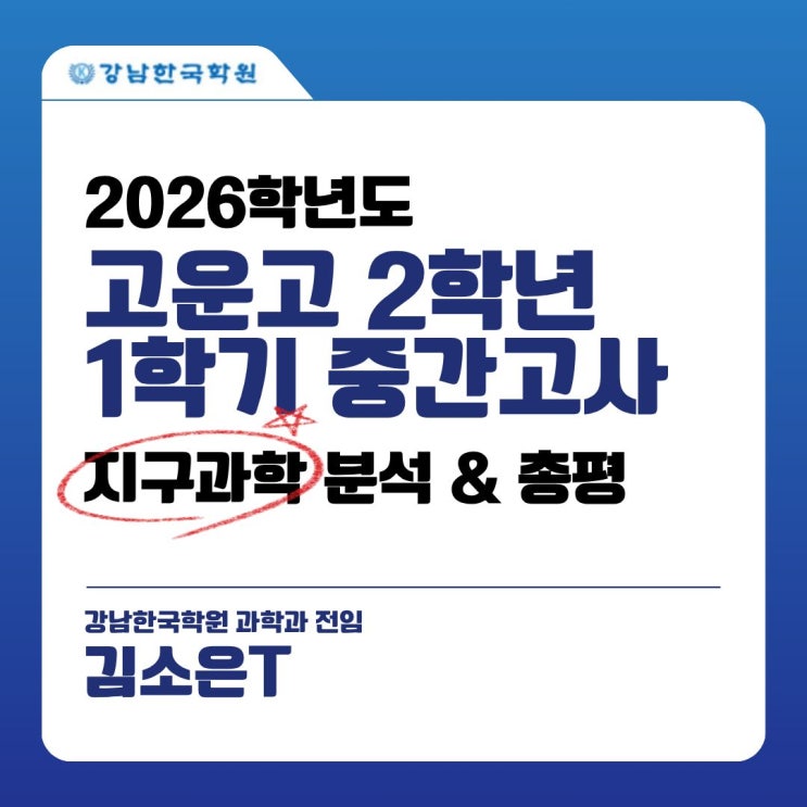 안녕하세요! 세종시 입시전문가그룹 강남한국학원입니다. 고운고등학교 2학년 1학기 지구과학 중간고사 잘 마치셨나요? 축하합니다 과학 김소은T 現 강남한국학원 중 · 고등부 과학과 전임 한국교원대학교 지구과학교육과 전공 前) 한국교원대학교 IB교육자 과정 소단위 전공 前) 이투스 사설 모의고사 출제위원 前) 고양국제고등학교 졸업 1️⃣ 수능 유형으로 점철된 난이도 “최상”의 시험지 100점이 없을 것으로 예상됩니다. 모든 문항이 수능식 자료 해석 유형으로 출제되었으며, 내용적으로도 수능 혹은 평가원 기출문제에서 높은 변별력을 보였던 문항의 변형문제들이 많았습니다. 킬러 문항 뿐만 아니라 특히 중위권 학생들이....... <img src="https://blogthumb.pstatic.net/MjAyNjA0MjlfMjA0/MDAxNzc3NDYyMjkwNTQz.Qsgcz_Wz2oCaQ7nnHcz-ro36JjfLDEjG6P3SL0f37zEg.vaJ_c6SVLbBfmNP8y7QLlpCMkraU9zmr2whgbpgf7-gg.JPEG/%C1%A6%B8%F1%C0%BB_%C0%D4%B7%C2%C7%D8%C1%D6%BC%BC%BF%E4.-_%BA%B9%BB%E7%BA%BB_%283%29.jpg?type=s3" />
