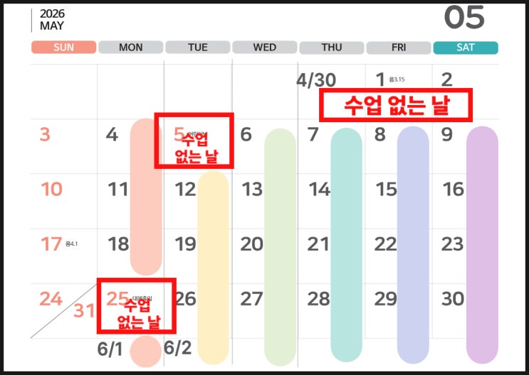 1. 5월 수업 회차 안내 5월 수강기간은 5/4 - 6/2까지입니다. 5주차 수업으로 ※5/1(금), 5/2(토), 5/5(화), 5/25(월) 휴강일입니다. 2. 5월 수업료 결제 기간 4월 27일(월) - 5월 2일(토)까지 4월 27일(월)부터 5월 2일(토)까지는 5월 수강료 납부기간입니다. 교육원의 원활한 운영을 위해 기한내 결제를 부탁드립니다. 4. 고려대학교 경시대회 대비반 모집 4월 중순부터 고려대학교 경시대회 대비반을 모집합니다. 결과뿐만 아니라 시도를 통해 좋은 수학 실력 만들기 고려대학교 경시대회의 목적은 준비하는 과정속에서 멘사둥이들의 실력이 향상입니다. 어느 초등학생이나 1분안에 문제 단순 연산10개 풀기는 쉽게 해내지만, 80분동안 꼼꼼히....... <img src="https://blogthumb.pstatic.net/MjAyNjA0MjlfMjkg/MDAxNzc3NDU0NTI4MTg1.YUpEyDioB6FvKOyKj1MHqwXuPeTw3BlWoiyNmlz_07wg.TkX9NdMXPYtMHPou43NDnIqLUOyRbegDfQPWA5upGYog.JPEG/%BC%F6%BE%F7%C0%CF%C1%A4_%B4%DE%B7%C2-012.jpg?type=s3" />