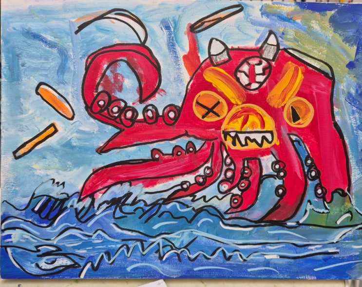초1, 윤이 오늘은 A3 캔버스를 가득 채워 크라켄을 완성했습니다. 현란한 붓질, 망설임 없는 터치, 자신감이 온몸에서 넘쳐흐릅니다. 그런데 더 감동적인 건 따로 있었습니다. 앞에 앉은 누나에게 설명을 해주고 있었는데, 가만히 다가와 귓속말로 말합니다. “선생님, 전에 말씀드렸죠… 그거요.” “응?” “누나 생각이 있을 거니까 가만히 보고 있으면 어떻게든 잘하게 된다고요.” 지지난주, 윤이가 저에게 했던 그 말을 다시 꺼내는 순간이었습니다. 한참 웃다가, 이렇게 말해줬습니다. “맞다. 선생님 생각이랑 윤이 생각이 같았지.” 방향을 찾는 시간이 지나고, 이제는 그냥 해보는 아이가 되었습니다. 아이들의 시간은 지나가지만, 이....... <img src="https://blogthumb.pstatic.net/MjAyNjA0MjdfMTU0/MDAxNzc3Mjk0MzE0ODQz.3sNGU8o5D5rUL_FSVQAmn5oMuz4NMwOk6jbBVrfXqUsg.vLx-PnlJ7tCY5oPyZ8_c_utWnQ_DgM1NIP4Iy08odRsg.JPEG/900_20260427_163712.jpg?type=s3" />