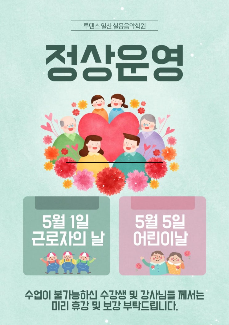 안녕하세요! 루덴스 일산 실용음악학원 입니다. 다가오는 5월 가정의 달! 5월 1일 근로자의날 5월 5일 어린이 날 정상운영 됩니다. 연휴에 수업을 받고 싶으신 수강생 분들 및 연습실을 이용하고 싶으신 모든 분들을 위해! 5월 가정의달 모두모두 행복하세요! 루덴스 일산 실용음악학원 상담 예약 및 무료 샘플 수업 https://naver.me/GYDADytA <img src="https://blogthumb.pstatic.net/MjAyNjA0MjNfMTg2/MDAxNzc2OTIxNjQ1MDE4.3yyv5so1RuKR96H6XUoa7T3WgQDyS_Cmx8qXFuExN4Ug.GHZNhxakT_fwlyWUFDF69TpH4o6cq82Cqv6rbwTr09wg.JPEG/%C1%A6%B8%F1%C0%BB_%C0%D4%B7%C2%C7%D8%C1%D6%BC%BC%BF%E4._%2818%29.jpg?type=s3" />