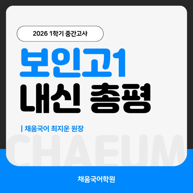 2026 1학기 중간고사 보인고1 내신 총평 영상 2026 1학기 중간고사 국어 내신 총평 안녕하세요, 채움국어입니다! 2026학년도 1학기 중간고사 국어 시험에 대한 전반적인 분석과 대비 방향을 정리해드립니다. 이번 시험은 단순 암기보다 기출 분석과 독해력이 핵심이었습니다. PART 1. 내신 시험 분석 이번 시험은 총 24지문 중 11지문이 적중되었으며, 특히 유사 문학 문제까지 정확히 맞춘 점이 특징입니다. 또한, 문법 기출 (2020, 2024년)을 기반으로 3주차, 4주차 테스트를 통해 충분히 대비가 가능했던 시험이었습니다. 기출 중심 학습의 중요성 확인 실전 대비 테스트의 효과 입증 PART 2. 시험 난이도 : 중상 전체 난이도는 중상 수준으로....... <img src="https://blogthumb.pstatic.net/MjAyNjA0MjRfMjk3/MDAxNzc3MDE4NDczOTc0.KlwZI4pTt_4ezB4Xvp5j6LdQFDg_L4jrVm0qysL8KYUg.tkZ-44VkjWHRS8aIEAr4G04nf0dlBj__qWyjyFRkqW0g.PNG/1.png?type=s3" />