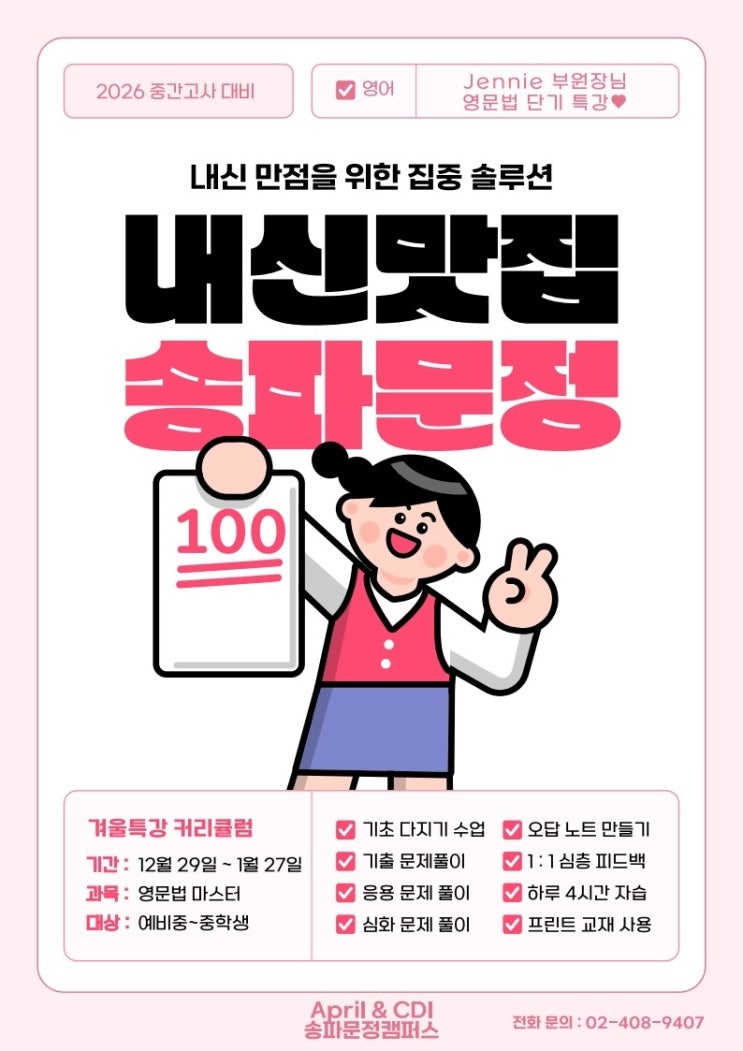 송파 중등 영어 내신, 이렇게 준비합니다 [CDI 송파문정 청담어학원 중등부 내신 관리 시스템] 안녕하세요, CDI 송파문정 청담어학원입니다. 중등 내신 영어, 단순 암기로는 절대 고득점을 만들 수 없습니다. 출제 포인트를 정확히 읽고, 실수 없이 적용하는 훈련이 핵심입니다. 저희 송파문정 캠퍼스에서는 4월 6일(월) ~ 4월 24일(금) 총 3주간 중등부 내신 대비 집중 프로그램을 운영합니다. 1. 하루 2시간 추가 집중 관리 시스템 중등 내신에서 가장 중요한 것은 절대 학습량 + 반복 훈련입니다. 대상 월수 / 월금 / 화목 반 운영 방식 정규 수업 외 추가 2시간 집중 학습 수업 전 2시간 조기 등원 또는 수업 후 2시간 잔류 학습 학생의 컨디....... <img src="https://blogthumb.pstatic.net/MjAyNjA0MjRfMjkw/MDAxNzc3MDA0MDQ2ODU0.mH43Utbpwt4h-6pUE_74CBO3dSp_gXCF1lU_FLoYvTYg.4fzNBmrdTCDs4xETkxSDP_cu6NYZQKfks1lNR9jU6dwg.JPEG/IMG_4460.jpg?type=s3" />