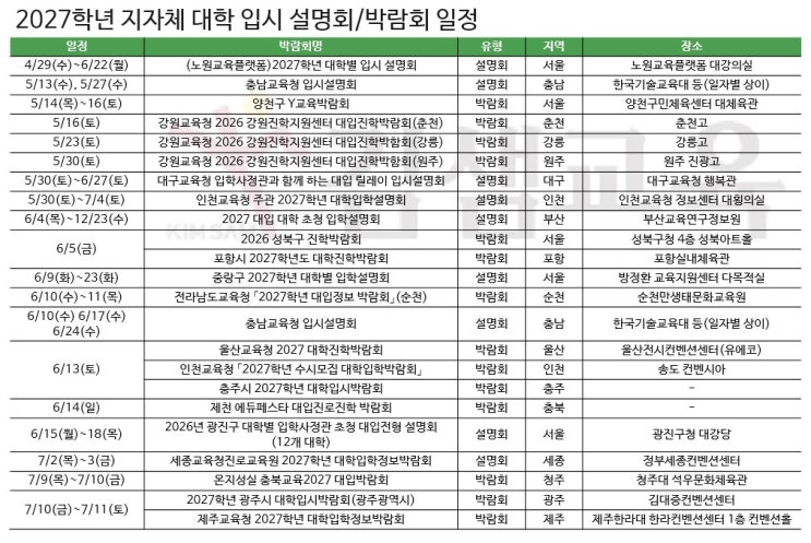2027 대입박람회,설명회 일정 2027학년도 대입을 앞두고 교육청과 지방자치단체가 주관하는 입시설명회와 대입박람회 일정이 본격적으로 시작되고 있음. 다양한 대학이 참여하는 설명회와 대규모 박람회가 전국적으로 열리면서 수험생과 학부모가 직접 입시 정보를 확인할 수 있는 기회가 확대되는 추세. 특히 대학이 직접 전형 방식, 전년도 입결, 지원 전략 등을 설명하기 때문에 신뢰도 높은 정보를 얻을 수 있는 것이 큰 장점. 박람회의 핵심은 대학별 부스에서 진행되는 1대1 상담. 대학은 축적된 지원 데이터를 바탕으로 실제 합격 가능성을 보다 현실적으로 안내할 수 있어 실질적인 전략 수립에 도움이 됨. 또한 지역 교사들이 참여하는....... <img src="https://blogthumb.pstatic.net/MjAyNjA0MjRfMjg5/MDAxNzc2OTk4OTQzNjc4.VWXfEFSyvC3dtXB2zJAWQByf-eDhH8FLMDgm0y3wUggg.LQwUAlVDh3ax5AWoPX5v8Z1d8ZJMUP1FoQv2dXm-qEkg.JPEG/9.jpg?type=s3" />