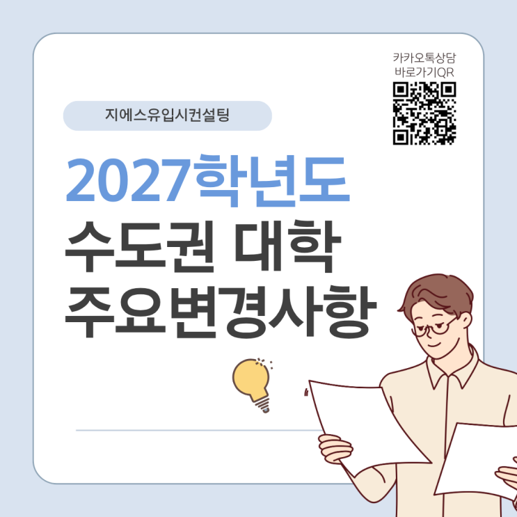 안녕하세요 지에스유입니다. 오늘은 2027학년도 수도권 주요 대학들의 입시 변경사항을 안내해드릴게요. 2027학년도 대입부터는 대학별 전형 방식이 꽤 많이 달라지는데, 어떤 학교에서 어떤 사항들이 달라지는지 자세히 설명 드릴게요. 서울대학교 먼저 서울대의 변화입니다. 체육교육과의 수능 최저 폐지는 지원자 풀의 변화를 가져올 수 있는 중요한 변수입니다. 연세대학교 다음은 연세대입니다. 연세대 핵심 변화 요약 전형 성격 변화: 국제인재 전형이 실기/실적 위주에서 학생부종합전형으로 변경되었습니다. 선발 인원 확대: 국제형(국내고) 전형의 1단계 선발 배수가 5배수로 확대되어 면접 기회가 늘어났습니다. 응용통계학과 개....... <img src="https://blogthumb.pstatic.net/MjAyNjA0MzBfMjAg/MDAxNzc3NTU4MDA3NTY0.O5bn_2OVZQfwlld8LIq9KPcHvuE5147B6Ki44hawrQEg.Zy9yiISHM_JCj1yJhElxoO4qsjROIXIUChZ-pDNbm24g.PNG/2_%2834%29.png?type=s3" />
