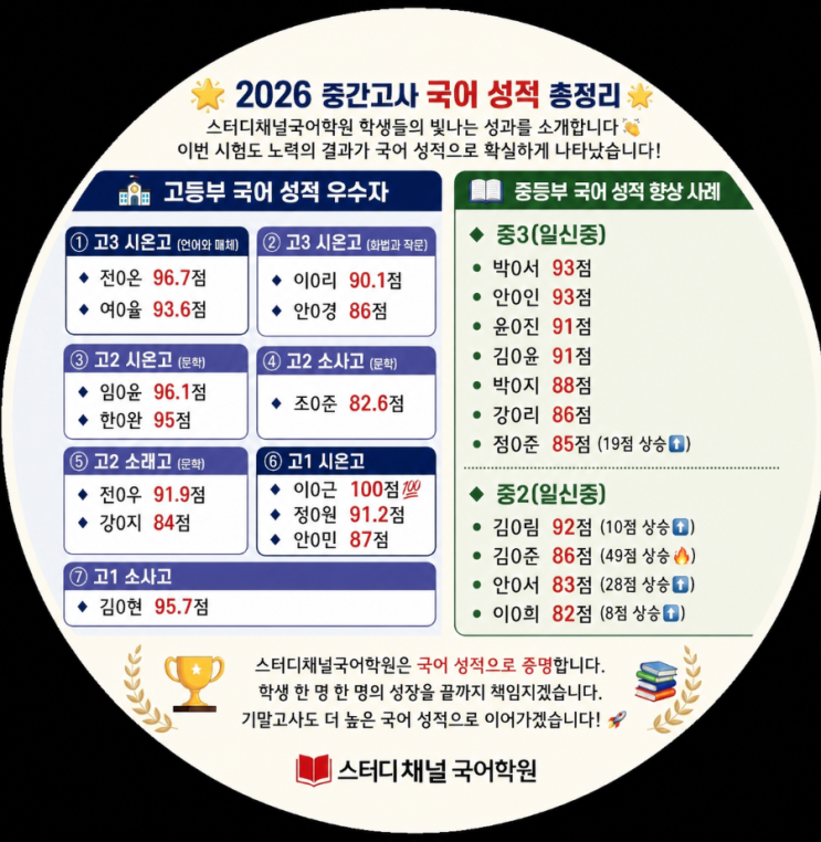 2026 중간고사 국어 성적 총정리 스터디채널국어학원 학생들의 빛나는 성과를 소개합니다 이번 시험도 노력의 결과가 국어 성적으로 확실하게 나타났습니다! ━━━━━━━━━━━━━━ 고등부 국어 성적 우수자 ━━━━━━━━━━━━━━ ① 고3 시온고 (언어와 매체) 전0온 96.7점 여0율 93.6점 ② 고3 시온고 (화법과 작문) 이0리 90.1점 안0경 86점 ③ 고2 시온고 (문학) 임0윤 96.1점 한0완 95점 ④ 고2 소사고 (문학) 조0준 82.6점 ⑤ 고2 소래고 (문학) 전0우 91.9점 강0지 84점 ⑥ 고1 시온고 이0근 100점 정0원 91.2점 안0민 87점 ⑦ 고1 소....... <img src="https://blogthumb.pstatic.net/MjAyNjA0MjlfMjU3/MDAxNzc3NDYxMDM2ODYx.fFusV3CtnSK2-FM7lrciDE5344Psd_Usf0P0UQtdR14g.jXgU1WHXj9LP37OjQyKklDO3gXPD7xQodGJcCxXj-lAg.PNG/900_1777460884810.png?type=s3" />