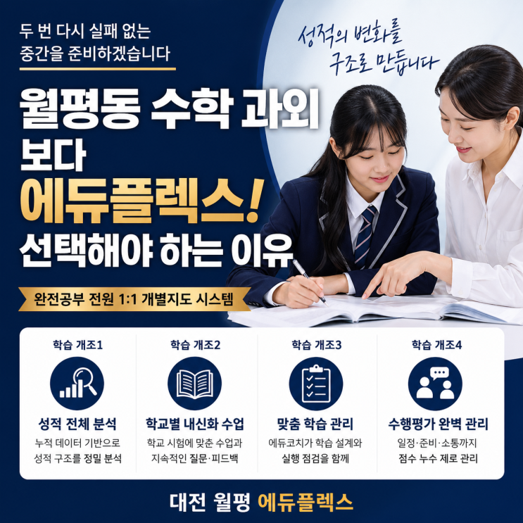 월평동 수학 과외를 고민하시는 분들이 많습니다. 개별적으로 집중해서 배울 수 있다는 점에서 분명 장점이 있지만 실제로 성적이 변하지 않는 경우도 많습니다. 이유는 단순합니다. 수업만 있고 관리가 없기 때문입니다. 월평동 수학 과외는 문제를 설명해주는 데는 집중하지만 공부의 전체 구조를 바꾸는 데까지는 이어지지 않는 경우가 많습니다. 지금 필요한 것은 단순한 설명이 아니라 성적이 오르지 않는 이유를 정확히 찾아내고 바꾸는 과정입니다. 대전 월평 에듀플렉스는 이 지점에서 시작합니다. 두 번 다시 실패 없는 중간을 준비하기 위해 단순한 수업이 아니라 학습 전체를 다시 설계합니다. 변화는 수업이 아니라 관리에서 시작됩....... <img src="https://blogthumb.pstatic.net/MjAyNjA0MjZfMjEy/MDAxNzc3MTk5MTExNjY2.is0YnUTQhdSD_1CQ3OaU8e9ua40SFLDRUKPxNhzDUrYg.TDQll5DoY6HcUNTTI3BrDW10o9-iEIxRx4sMCMV7qp8g.PNG/ChatGPT_Image_2026%B3%E2_4%BF%F9_26%C0%CF_%BF%C0%C8%C4_07_25_06.png?type=s3" />