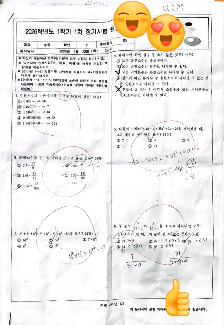 안녕하세요..엠엠피학원입니다. 기다리고 기다리던 시험이 오늘로 끝~~~ 일요일마다 나와서 햇빛과 등지고 시원한 에어컨 바람을 받으며 의자에 앉아서 문제집과 전쟁을 한 단원이 끝나고 나면 또 심화문제와 킬러 문제가 기다리고ㅜㅜ 킬러 문제의 끝은 어디에 있는지? 하루하루가 호랑이와 떡 할머니처럼 떡 하나 주면 안 잡아먹을게..... 하지만 떡은 먹고..... 고개를 넘어가는 과정이 너무나 힘들고 지치고 하지만 결과물은 당연 100점은 있고 조금씩 올라가는 아이들 시험을 보느라 지쳐 보이기도 하고 자기보다 더 무거운 가방을 메고 학원 오는 모습을 보고 짠하기도 합니다. 시험 난이도 저희가 어찌 평가를 할까요? 전반적으로 상, 중....... <img src="https://blogthumb.pstatic.net/MjAyNjA0MjlfMjUg/MDAxNzc3NDYzNjc0NjI3.u29_46W1_jod04cW1C_ly109PYGShazRV5WEH-79uAwg.z6d5TC4lwFNpz3EgWzcmBUpeHxyRXGxa3WZuomWB--gg.JPEG/900%A3%DF1777459490050.jpg?type=s3" />