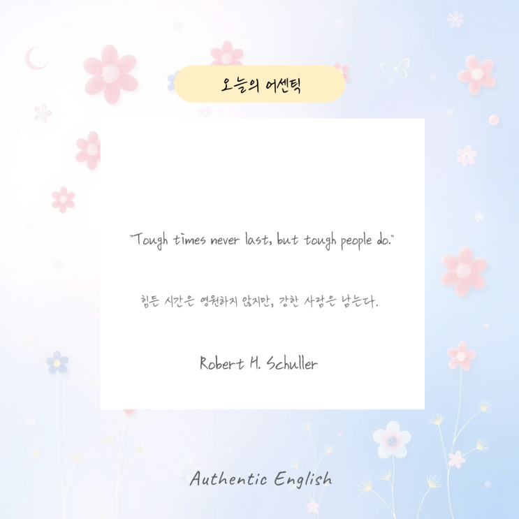 “Tough times never last, but tough people do.” 힘든 시간은 영원하지 않지만, 강한 사람은 남는다. Robert H. Schuller <img src="https://blogthumb.pstatic.net/MjAyNjA0MTBfMjYx/MDAxNzc1ODExMzY4ODQy.7bCR4Qn1LG2V_FOIW5OcugMWLU7todIsM5dkb8erJ7Yg.-enp5FrnSX6FJ4EBq1aiN5nekywiP9vjYyHNf9oGrqwg.PNG/012.png?type=s3" />