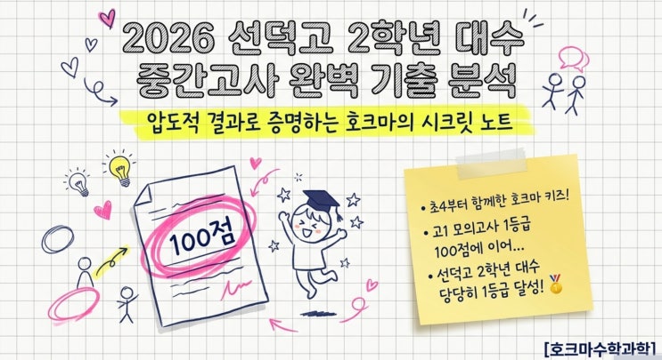 안녕하세요! 중계동수학학원 호크마수학과학입니다. 호크마 교육연구소의 2026학년도 선덕고 2학년 1학기 대수 중간고사에 대한 정밀 분석 리포트를 공유합니다. 선덕고2 대수 주요 지표 분석예상 1등급 컷 78점 내외 (고난도 변별력 확보) 출제 경향▶ 난이도의 점진적 상승과 모의고사 기출 변형을 통한 객관식 후반부 시간 압박 극대화 특이점▶ 삼각함수의 주기와 대칭성을 활용한 고난도 문항 출제 개념을 넘어선 정확한 '식 정돈' 능력이 1등급의 열쇠! 킬러 문항 해부 및 호크마의 솔루션 이번 시험의 성패는 23번(주기성과 실근의 합)과 24번(절댓값 로그함수 해석) 등 킬러 문항 에서 갈렸습니다. 23번 돌파전략 ▼....... <img src="https://blogthumb.pstatic.net/MjAyNjA0MjdfMTA1/MDAxNzc3MjY4NDE4NDc3.wMW2XCnHhLMTlKXOtKqEWo1UugHhQvIJGsb_zY30obUg.v5iDRSnevcgrr9RQLfW4LJygeC-N43GxTf6u8vSsRVEg.JPEG/%BD%BA%C5%A9%B8%B0%BC%A6_27-4-2026_143418_.jpeg?type=s3" />