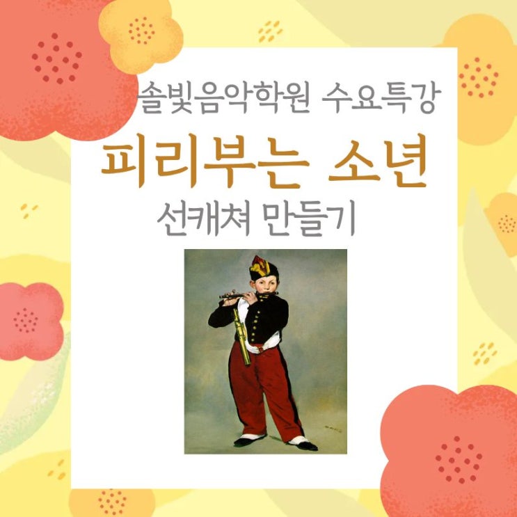 피리부는 소년들 음악을 감상하며 선캐쳐 만들기 특강을 했습니다. 음악도 재밌었지만 전래동화같이 전해지는 스토리가 있어서 아이들과 수업하며 나누는것도 즐거웠습니다. ^^ 다음달은 마켓데이로 만나요☆ ^^ <img src="https://blogthumb.pstatic.net/MjAyNjA1MDFfOTQg/MDAxNzc3NTYzNDQwNTE0.I4m3pBizMTTZU0TfbPC4HqsyIQVd5sZAARAThw2JWF8g.X-gUTdeaocZ8R0XRd4eVOL5OCyZHrxIRH3QuyGxWyxYg.JPEG/%C1%A6%B8%F1%C0%BB_%C0%D4%B7%C2%C7%D8%C1%D6%BC%BC%BF%E4.%281%29.jpg?type=s3" />