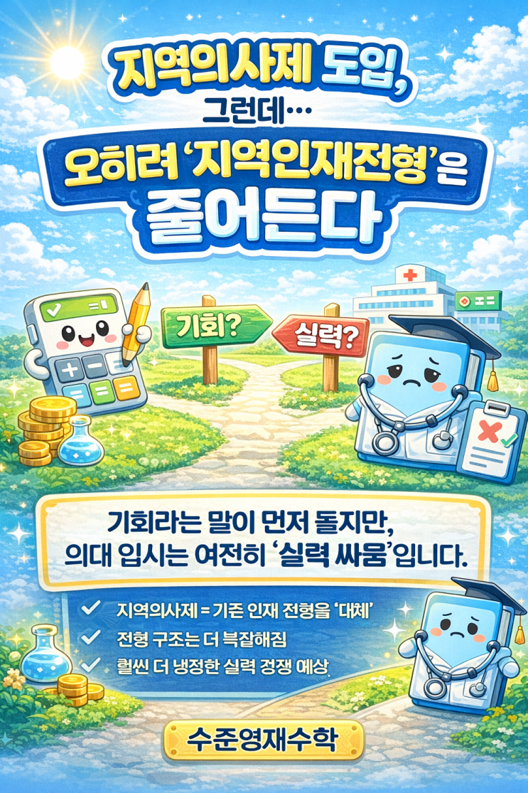 지역의사제 도입, 그런데 오히려 ‘지역인재전형’은 줄어든다 – 지방 학생에게도 쉽지 않은 의대 입시 현실 – 요즘 의대 입시에서 가장 큰 변화 중 하나가 바로 지역의사제 도입입니다. 많은 학부모들이 “지방 학생에게 기회가 늘어나는 것 아니냐”고 생각하지만, 최근 나온 기사 내용을 보면 현실은 정반대 방향으로 흘러갈 가능성이 큽니다. 결론부터 말씀드리면, 지역의사제가 생기면서 오히려 기존 ‘지역인재전형’은 줄어들 가능성이 높습니다. 1️⃣ 왜 이런 일이 벌어지는가? 현재 구조를 먼저 이해해야 합니다. 비수도권 의대는 정원의 약 60%를 지역인재전형으로 선발 여기에 2026년부터 지역의사제(의무 근무 조건)가 새로 추가....... <img src="https://blogthumb.pstatic.net/MjAyNjA0MTNfMjgw/MDAxNzc2MDE4MDk5NDYz.VS4CjBJpM4m0ImEE9JN9Ojx44pyLiwF1SbULMwN5HcAg.B5qnhXQ0eu5r0DctXZdhz0gm0PlA_DQjhMxqcwRtEA8g.PNG/file_000000006b08720b9befe995d7df900c.png?type=s3" />