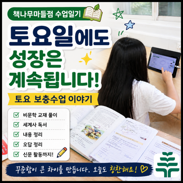 토요일에도 성장은 계속됩니다 :) 책나무 마들점 보충수업 이야기 주말이면 늦잠도 자고 싶고, 친구들과 놀고 싶은 마음이 더 큰 토요일. 하지만 토요일 보충을 하기위해 책나무 마들점에는 약속된 시간에 맞춰 성실하게 찾아온 학생이 있었습니다. 한 명뿐인 토요 보충수업이었지만 빠지지 않고 스스로 해야 할 일을 해내기 위해 온 모습이 참 멋졌습니다. 이번 수업에서는 먼저 비문학 교재 풀이를 진행했습니다. 문제를 푸는 것에서 끝나는 것이 아니라 틀린 문제는 왜 틀렸는지 다시 확인하며 오답까지 꼼꼼하게 정리했습니다. 이후에는 세계사 도서 읽기를 진행했습니다. 책을 읽고 중요한 내용을 정리하며 단순 독서가 아닌 ‘생각하며 읽....... <img src="https://blogthumb.pstatic.net/MjAyNjA0MjlfMjE5/MDAxNzc3MzkwODM3ODQ3.FJtIM_gdXEUlkfxH-sJzVc40uJWGY1x3yWIw9qvktPwg.Zf25Try8OeMhIPdFHe8zdGl6WBvzH8PI7Q20-jXEUgEg.PNG/900_20260429_004010_0000.png?type=s3" />