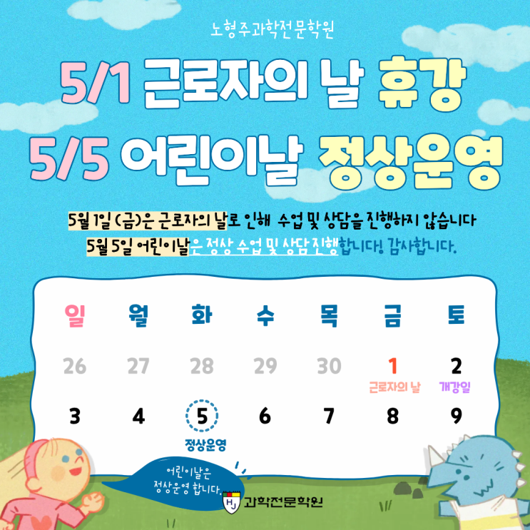 [은평구과학학원/노형주과학전문학원] 5/1(금) 근로자의 날 휴무 / 5/5 어린이날 정상 운영