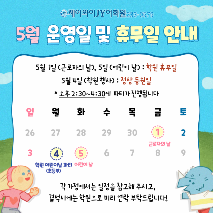 청주 개신동·가경동 영어학원 제이와이JY어학원5월 어린이날 학원 운영일 및 휴무일 안내
