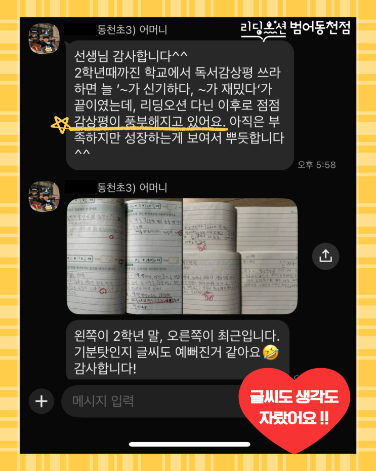 "감상평이 점점 풍부해지고 있어요" 동천초3학년 어머니 진심 어린 후기 범어동동천초 독서학원을 찾고 계신 부모님들께 실제 수강생의 성장 이야기를 솔직하게 전해드립니다. 동천초 3학년에 재학 중인 김한영(가명) 학생은 초1때에도 수업을 받으려고 했으나 다른 학원 스케줄로 시간이 맞지 않아 독서 수업을 미루고 있었습니다. 하지만 점점 편독이 심해지고 사실 위주 글쓰기만 하는 것을 보고 다른 스케줄을 다 조절하고 2026년 1월부터 리딩오션 범어동천점을 다니게 되었습니다. 4개월이 지난 지금, 어머니께서 직접 이런 메시지를 보내주셨습니다. 4개월 성장 기록 1월부터 4월까지, 한 달 한 달 달라진 한영이의 이야기 범어....... <img src="https://blogthumb.pstatic.net/MjAyNjA0MjRfMTEz/MDAxNzc3MDAxMDUyMjg3.Ny0evLTH7Vl00TzIp4Us7vO16gnwFG5lZ_0xUDd7bUUg.Q5QLcjAQhEqAlWMJC5z7Q9JkG1dVsx-J9lJVokMfhwcg.PNG/%C1%A6%B8%F1%C0%BB_%C0%D4%B7%C2%C7%D8%C1%D6%BC%BC%BF%E4._%288%29.png?type=s3" />