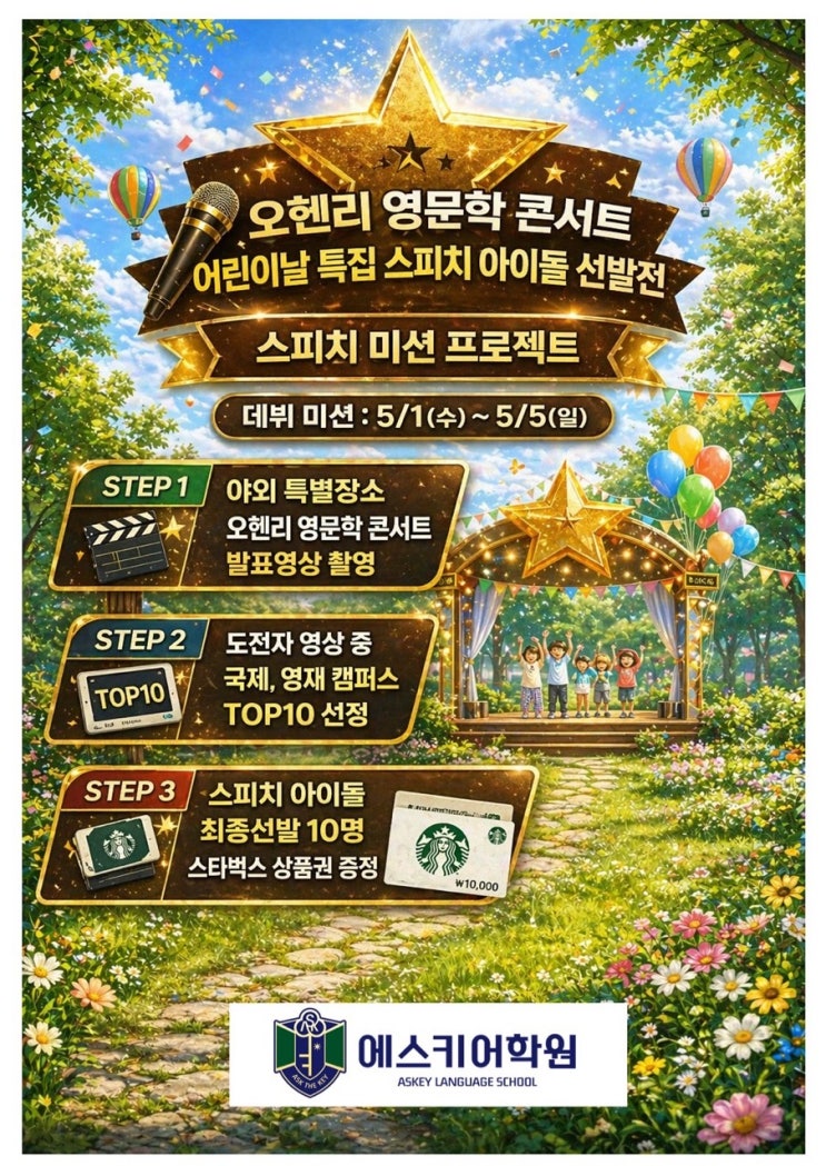 의왕영어학원 에스키어학원 <어린이날 특집! 제 8대 오헨리 영문학 콘서트 스피치 아이돌 선발전> 안내