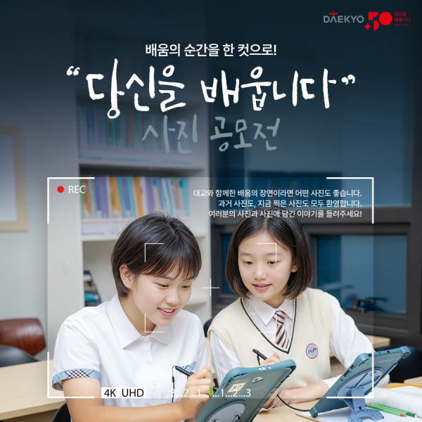 창립 50주년을 맞은 대교에서 고객 여러분과 함께 소중한 기억을 나누고자 ‘당신을 배웁니다’ 사진 공모전을 개최합니다. 이번 공모전은 단순히 촬영 실력을 겨루는 대회가 아닙니다. 대교와 함께했던 배움의 시간과 그 속에 담긴 성장과 감동을 기록하고 공유하는 데 더 큰 의미가 있습니다. 어릴 적 눈높이 학습지와 함께 성장했던 추억부터, 현재 아이와 함께하는 일상, 그리고 교육 현장에서 열정을 다했던 선생님과 직원분들의 경험까지. 대교와 연결된 '배움의 순간'이라면 과거와 현재의 사진 모두 환영합니다. 사진 공모전 ‘당신을 배웁니다’에 지금 휴대폰 속에 있는 소중한 사진 한 장과 사진에 담긴 이야기를 들려주세....... <img src="https://blogthumb.pstatic.net/MjAyNjA0MjlfOCAg/MDAxNzc3NDI0NzA2ODc2.opGOoMvPQg5amLIIq2BLVOVXW4FrYW1cgYcoIowWoi0g.5J52EJ5zMhkn1UIc9sN0uWlELPPnlVZKfsOfSYMMGUYg.JPEG/%BB%E7%C1%F8%B0%F8%B8%F0%C0%FC%BB%E7%C1%F8%B0%F8%B8%F0%C0%FC_0429.jpg?type=s3" />